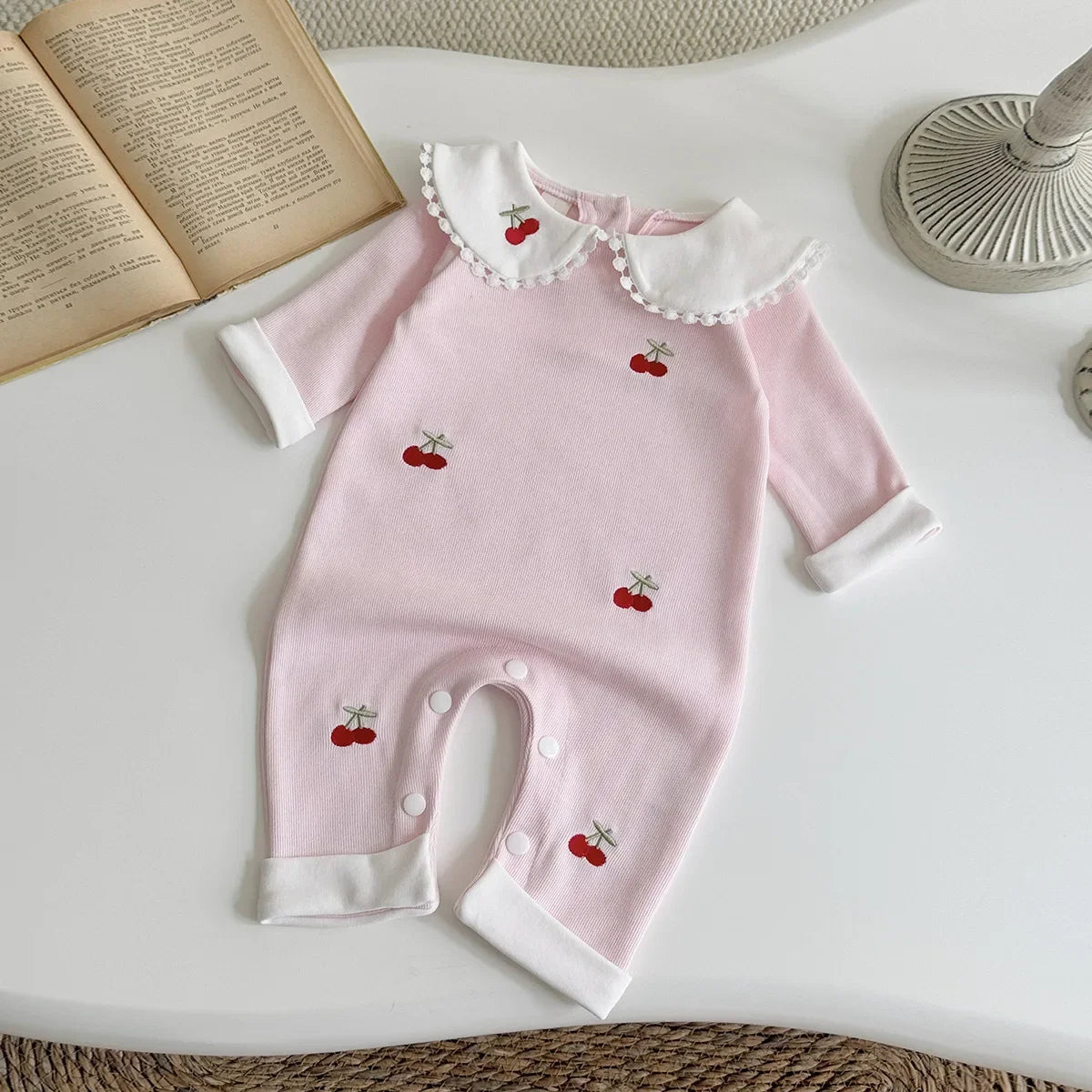 The Cherry Loved Toddler Embroidered Romper in charming Palm Beach Pink is an irresistible choice for little ones aged 1 to 18 months. This romper showcases adorable cherry embroidery on a soft, skin-friendly knitted polyester blend that feels gentle all day long. A delicate lace-trimmed Peter Pan collar adds a timeless, much-loved detail, while snap closures at the legs make diaper changes a breeze. Classic back buttons ensure an easy, true-to-size fit, and long sleeves keep your toddler cozy in any season. Wrinkle-resistant, stretchable, and easy-care, it’s perfect for baby shower gifts, family gatherings, holidays, or everyday fun. Capture sweet memories of your little one, or simply enjoy playful moments dressed in this darling romper. For an extra touch of charm, pair it with a set of sweet Mary Janes, sold separately, to complete the picture-perfect look that’s sure to melt hearts!