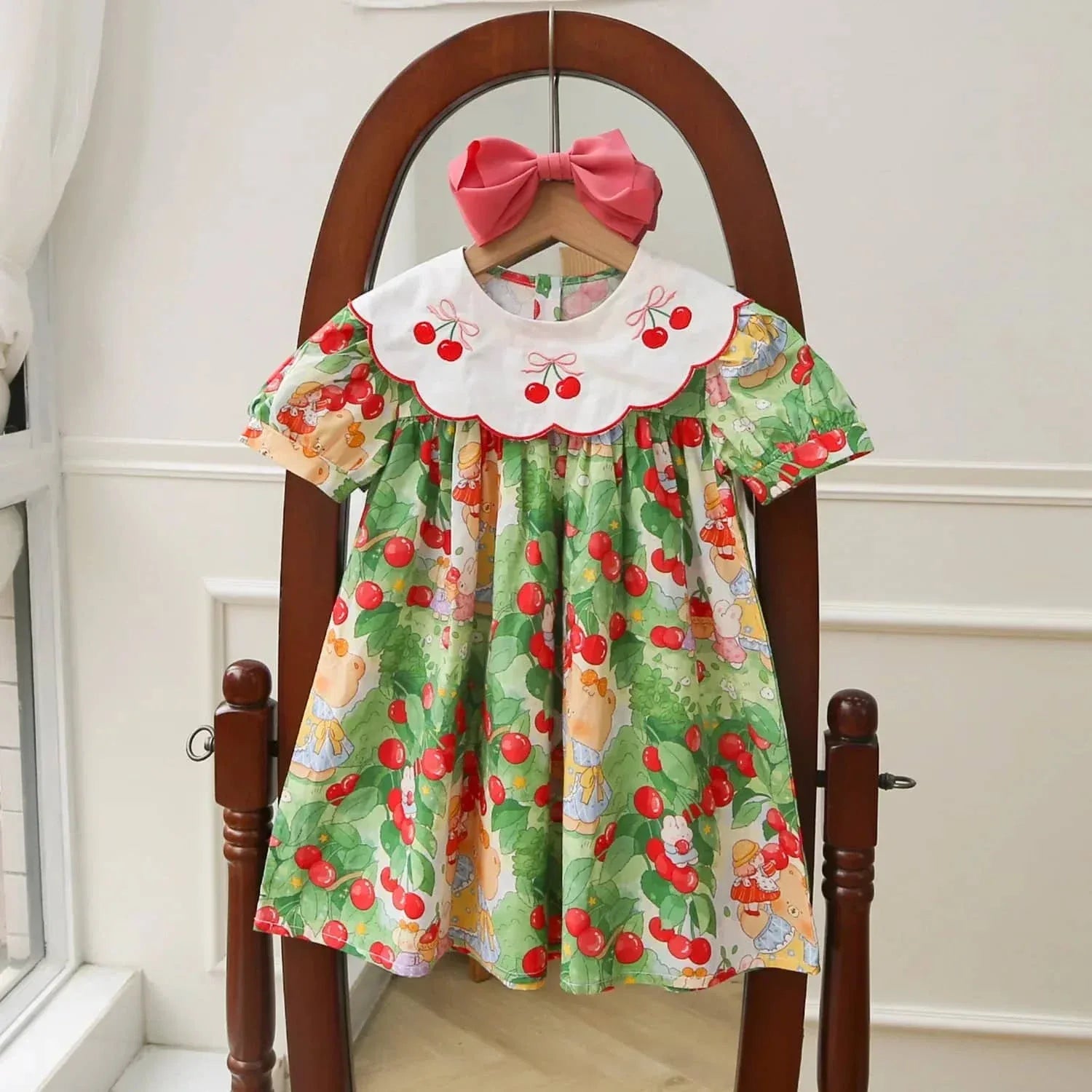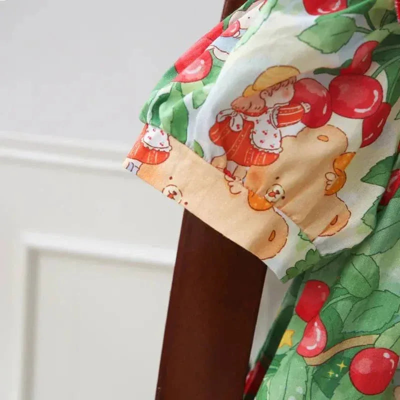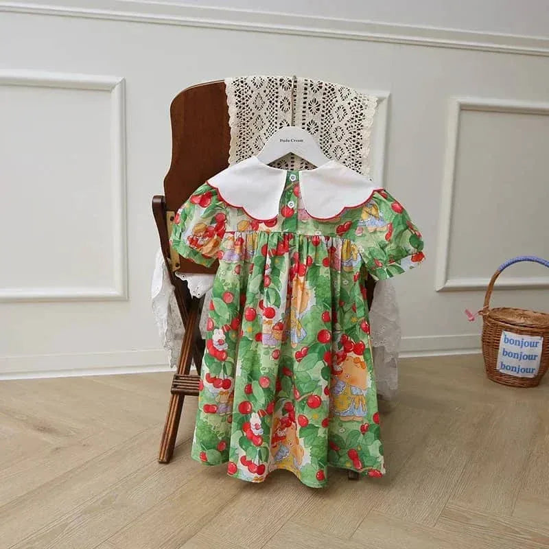 This cherry print dress for kids makes a lovely gift for birthdays or holidays. The playful print suits casual outings. The unique collar and vivid cherries also fit special family events. Pair with ballet flats or simple sandals for a complete look.