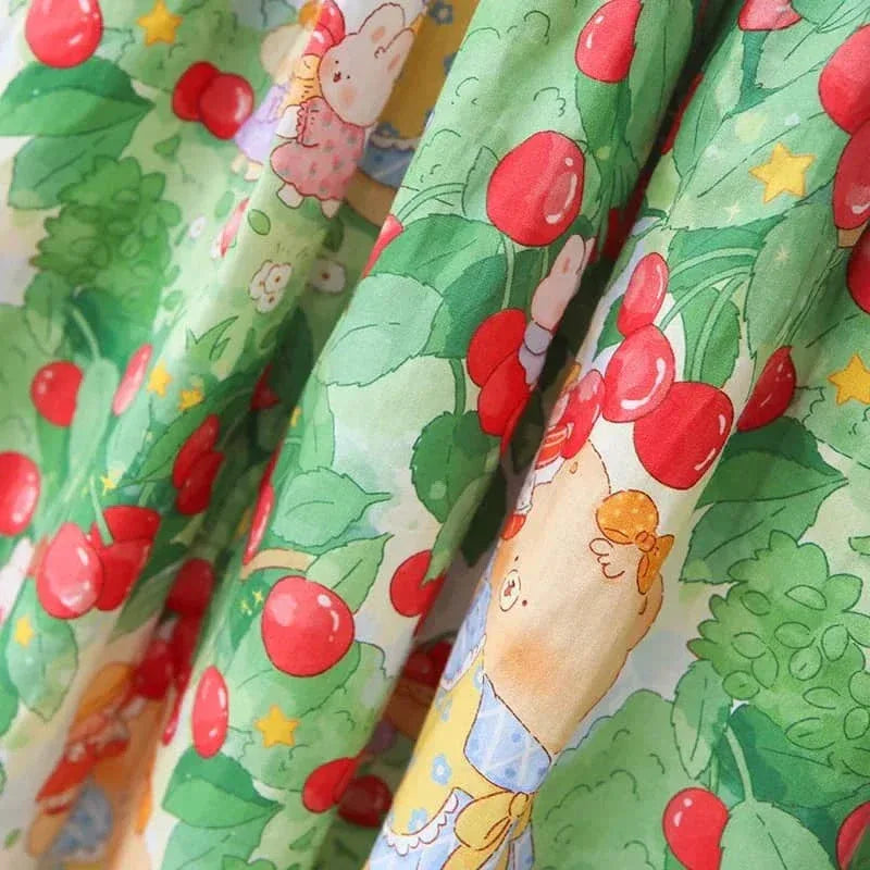 The cherry print dress for kids has an easy A-line shape. This design allows for free movement at playdates or special occasions. Red and green hues create a lively look. Every detail is made with care. The precise embroidery and finished edges add extra flair.