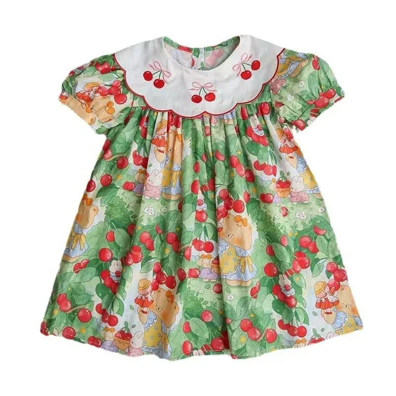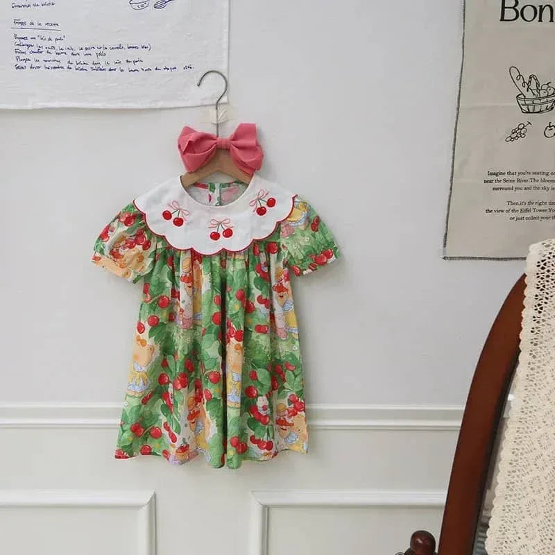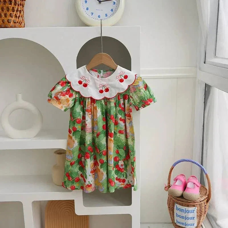 Cherry Print Dress for Kids with Embroidered Collar