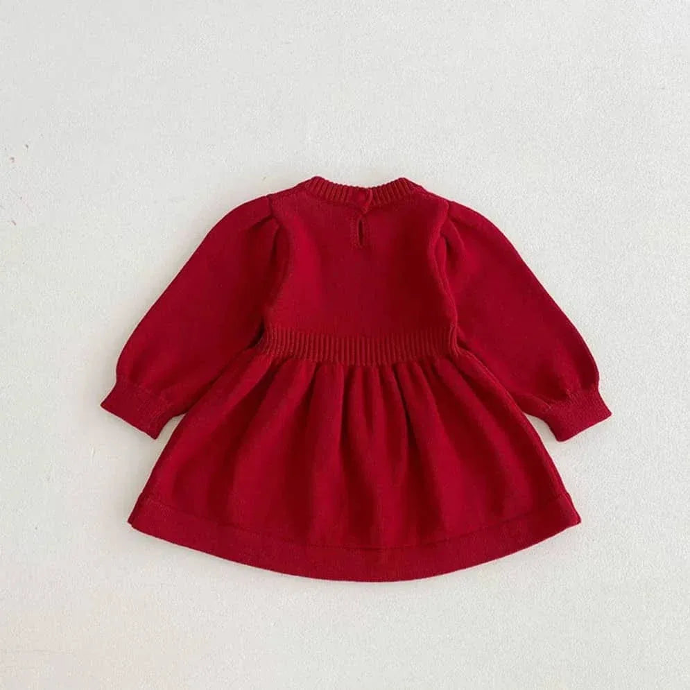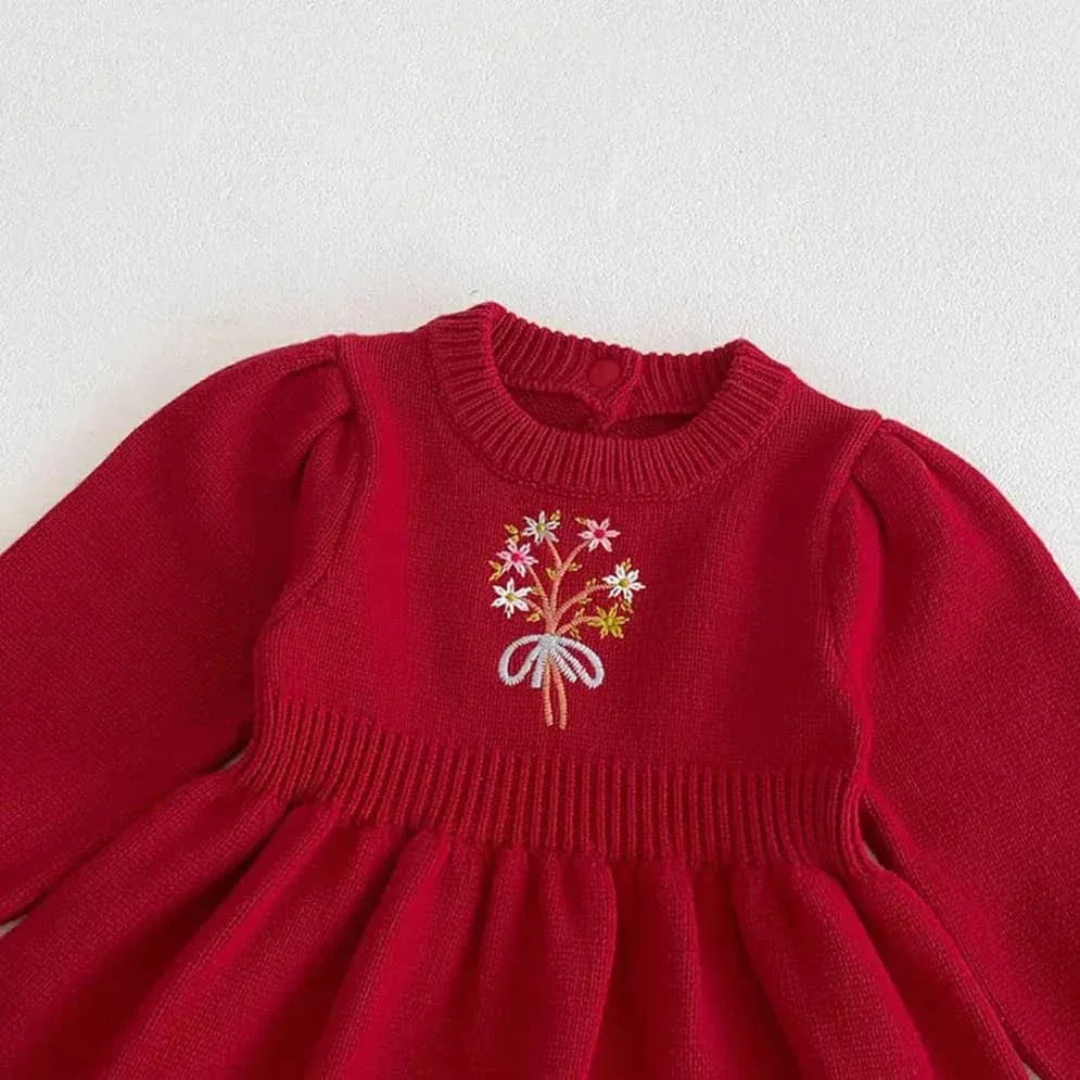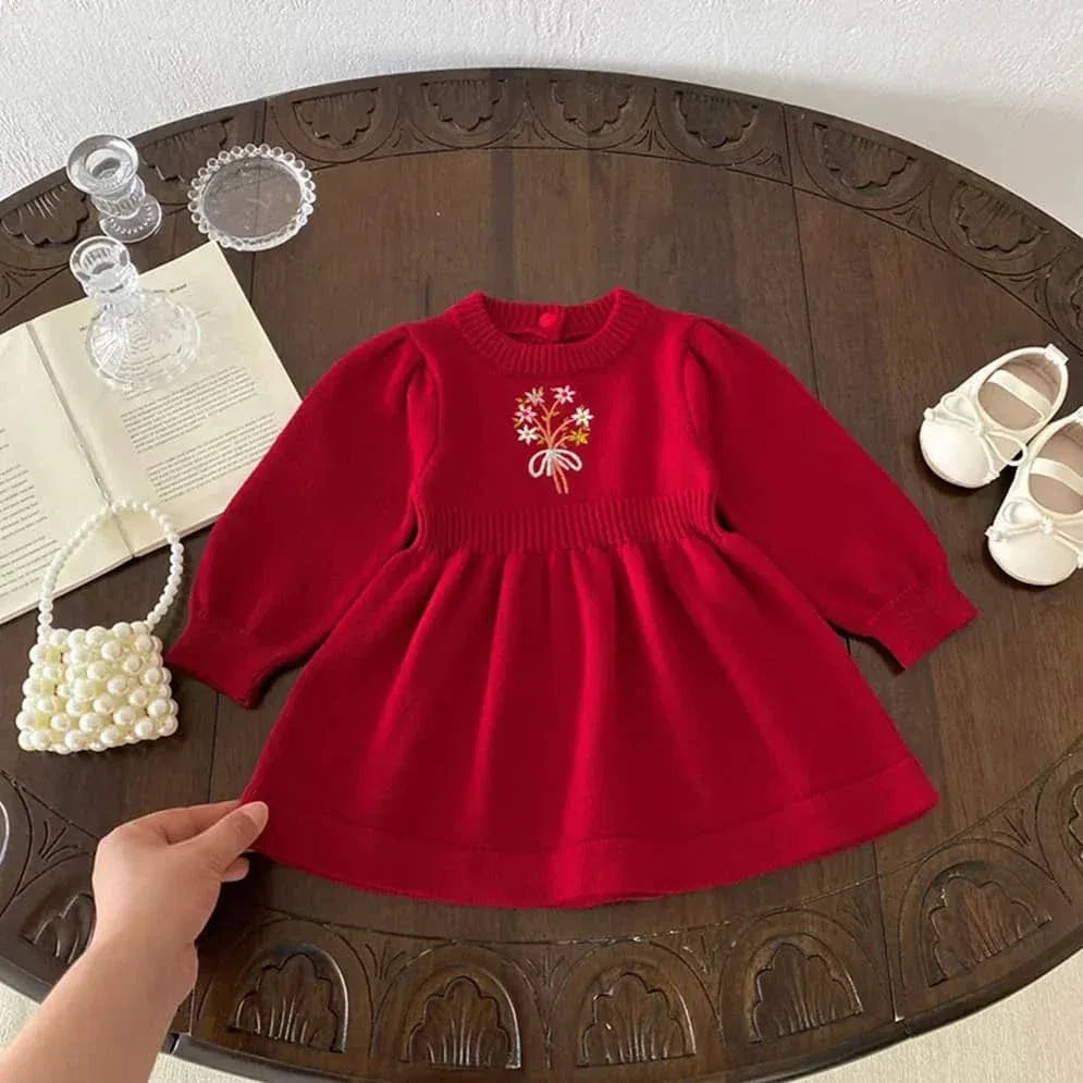 Cozy Winter Sweater Dress for Girls - Red Floral Knit