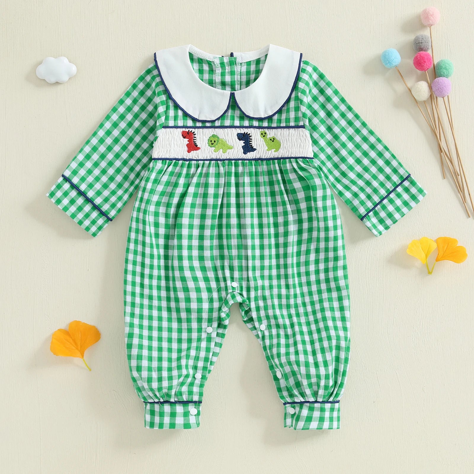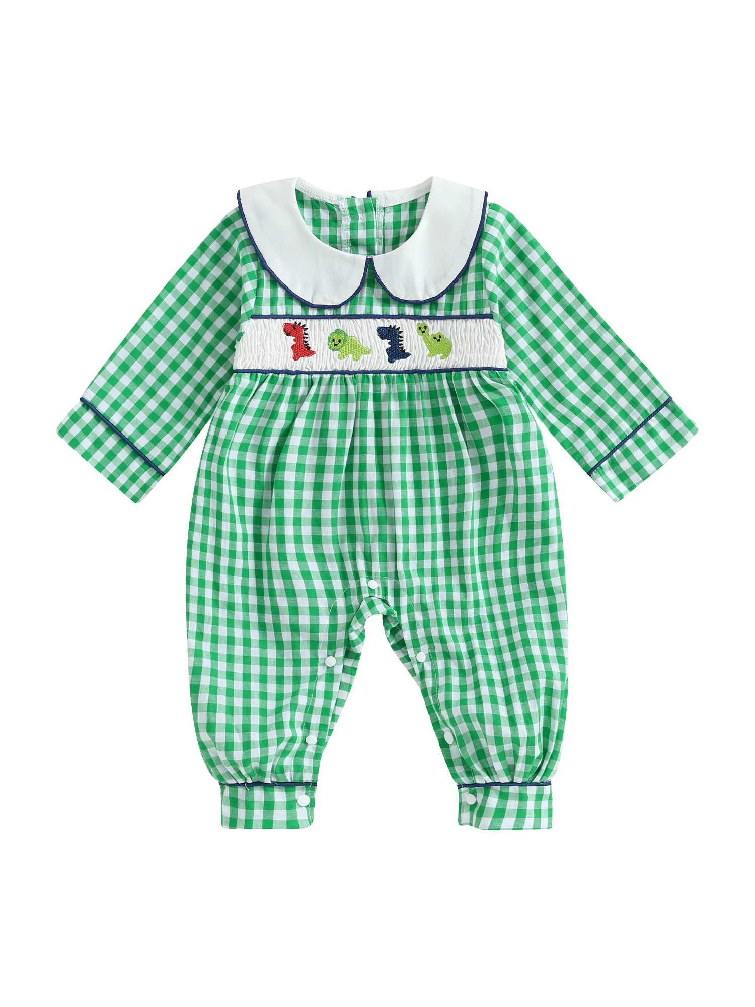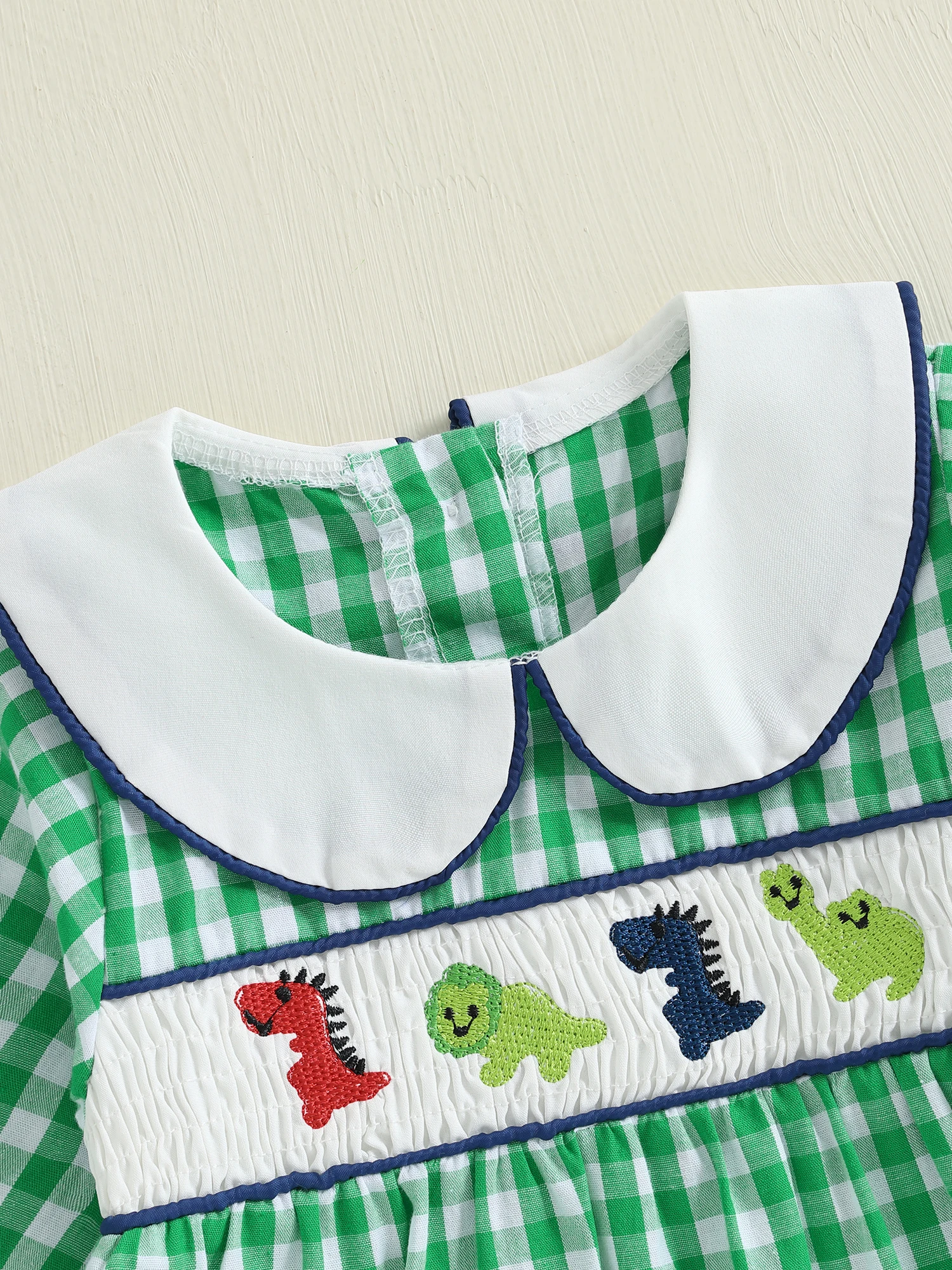"Dino-Might!" Long Sleeve Checked Peter Pan Collar Romper