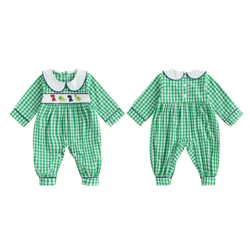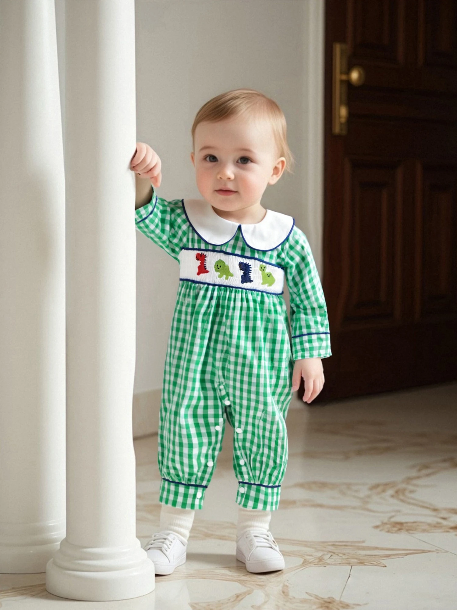 Unleash your child's inner roar with the "Dino-Might!" Long Sleeve Checked Peter Pan Collar Romper. This delightful one-piece not only embodies classic preppy charm but also adds a touch of prehistoric fun to your little one's wardrobe! Featuring a timeless Wentworth white and Royal Palm green checked pattern, this romper is adorned with charming smocked and embroidered dinosaurs that are sure to spark smiles everywhere.