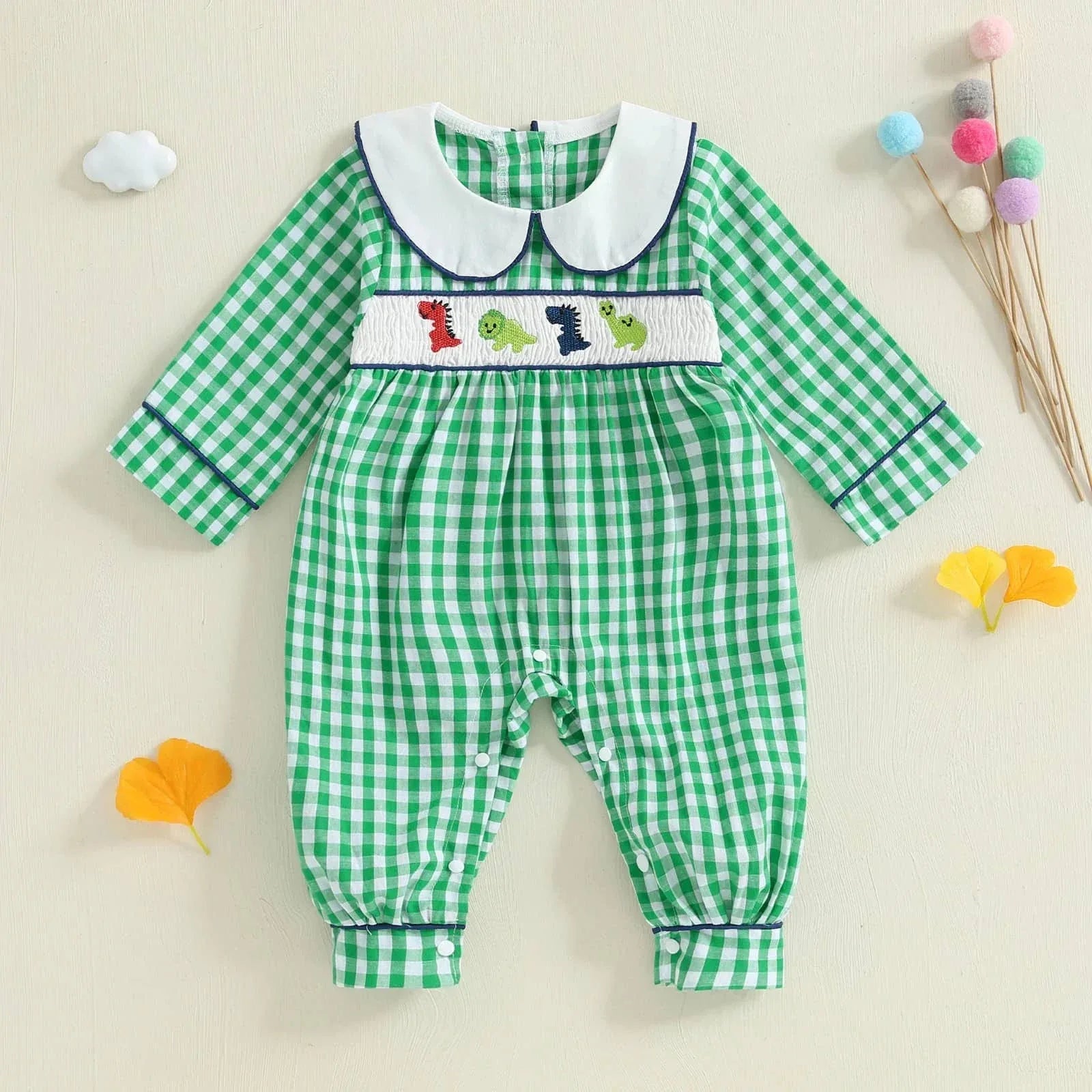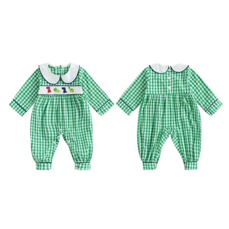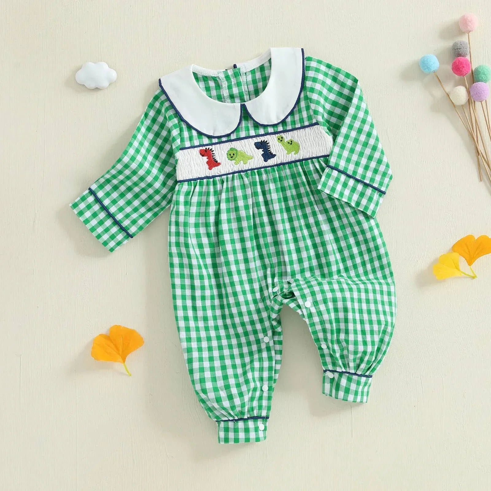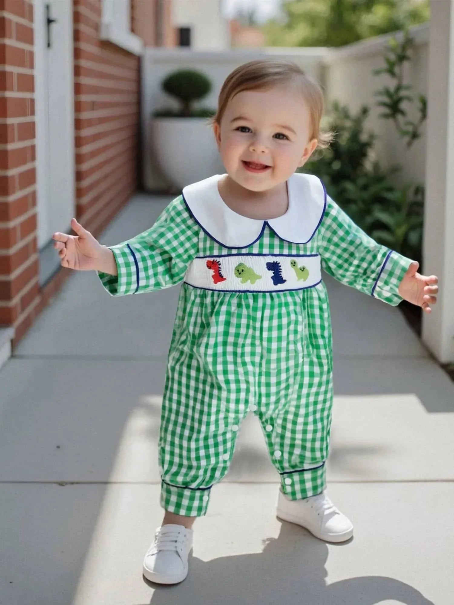 Dinosaur Baby Romper - Cute Green Checkered Jumpsuit