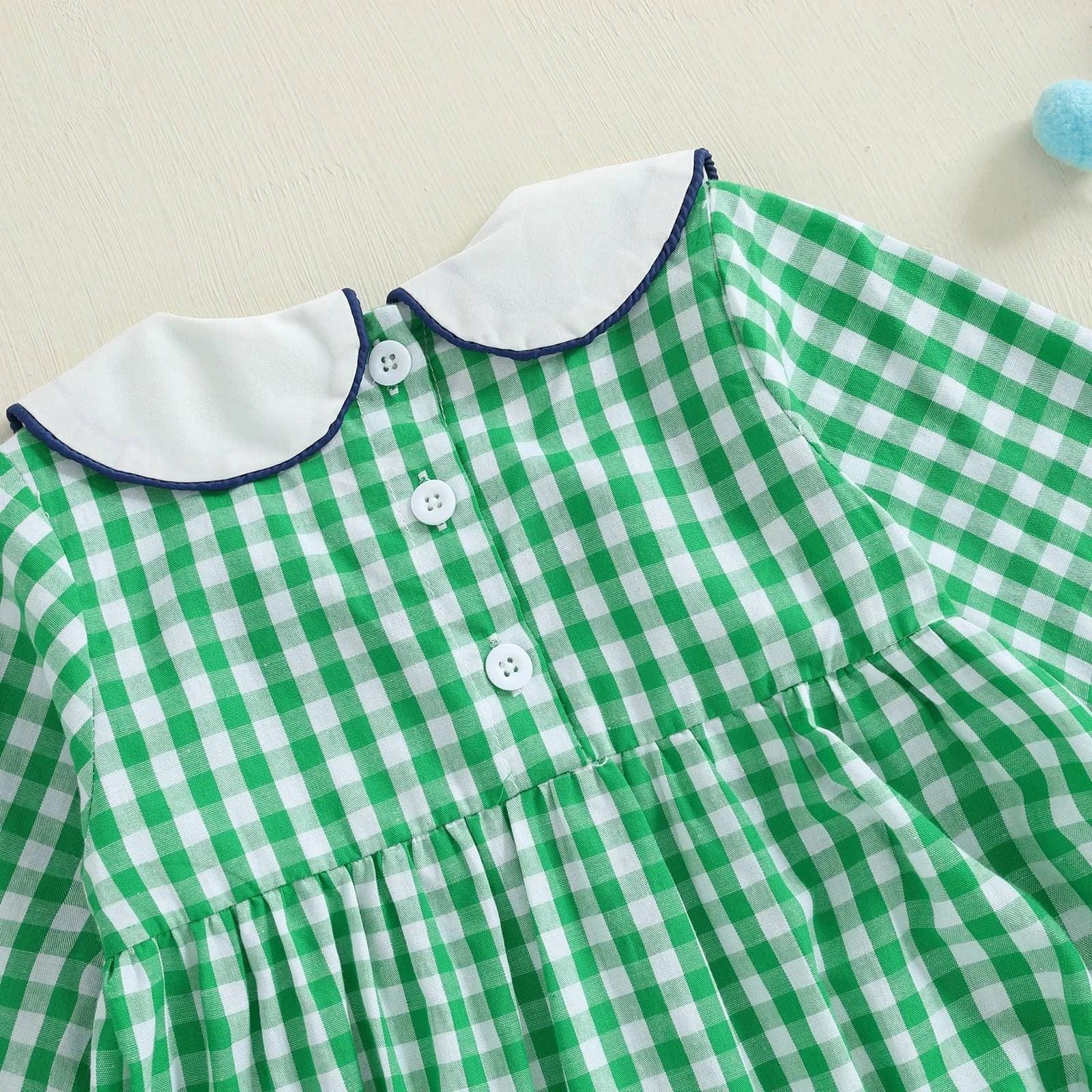 Introduce your little one to timeless style with the Dino-Might! Long Sleeve Checked Peter Pan Collar Romper. This dinosaur baby romper adds playful charm to any day. The soft cotton fabric feels gentle on your baby's skin. The classic green check pattern makes it perfect for all occasions.