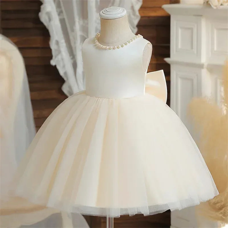 This dress combines elegance with comfort, featuring a uniquely styled V-back adorned with delightful bows. The knee-length design allows for ease of movement, ensuring she can play and dance freely while looking fabulous. The lightweight, sleeveless construction makes it ideal for warmer weather or layered with a cardigan or faux fur for cooler days.