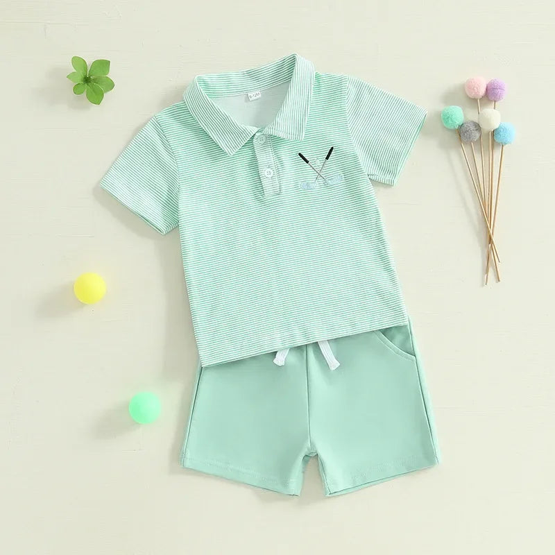 Available in vibrant colors like green and blue, this outfit is ideal for kids aged 6 months to 4 years. The button-front shirt comes equipped with a classic turn-down collar, providing a preppy look. Made from a soft blend of cotton and Spandex, it ensures a perfect fit and ultimate comfort for your little golfer.