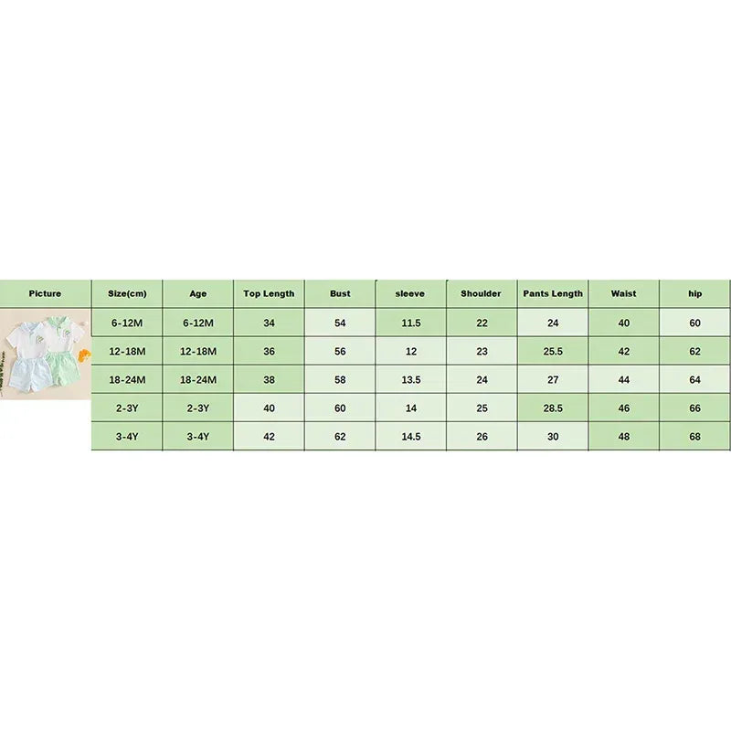 6-12M Tops Length: 34 Bust: 54 Sleeve: 11.5 Shoulder: 22 Pants Length: 24 Waist: 40 Hip: 60 Advised Age: 6-12 Months