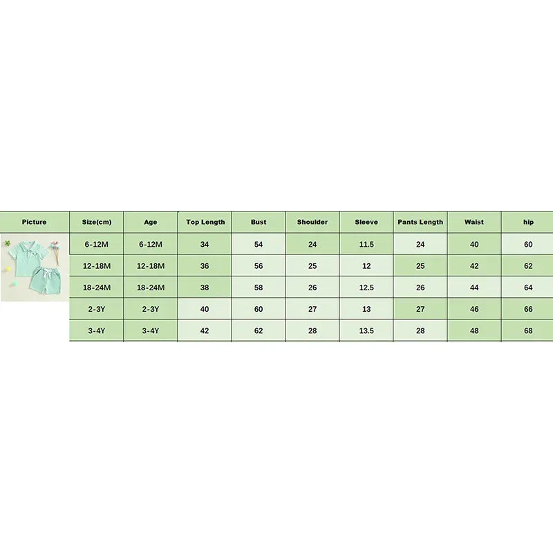 6-12M Tops Length: 13.39 Bust: 21.26 Sleeve: 4.53 Shoulder: 8.66 Pants Length: 9.45 Waist: 15.75 Hip: 23.62 Advised Age: 6-12 Months