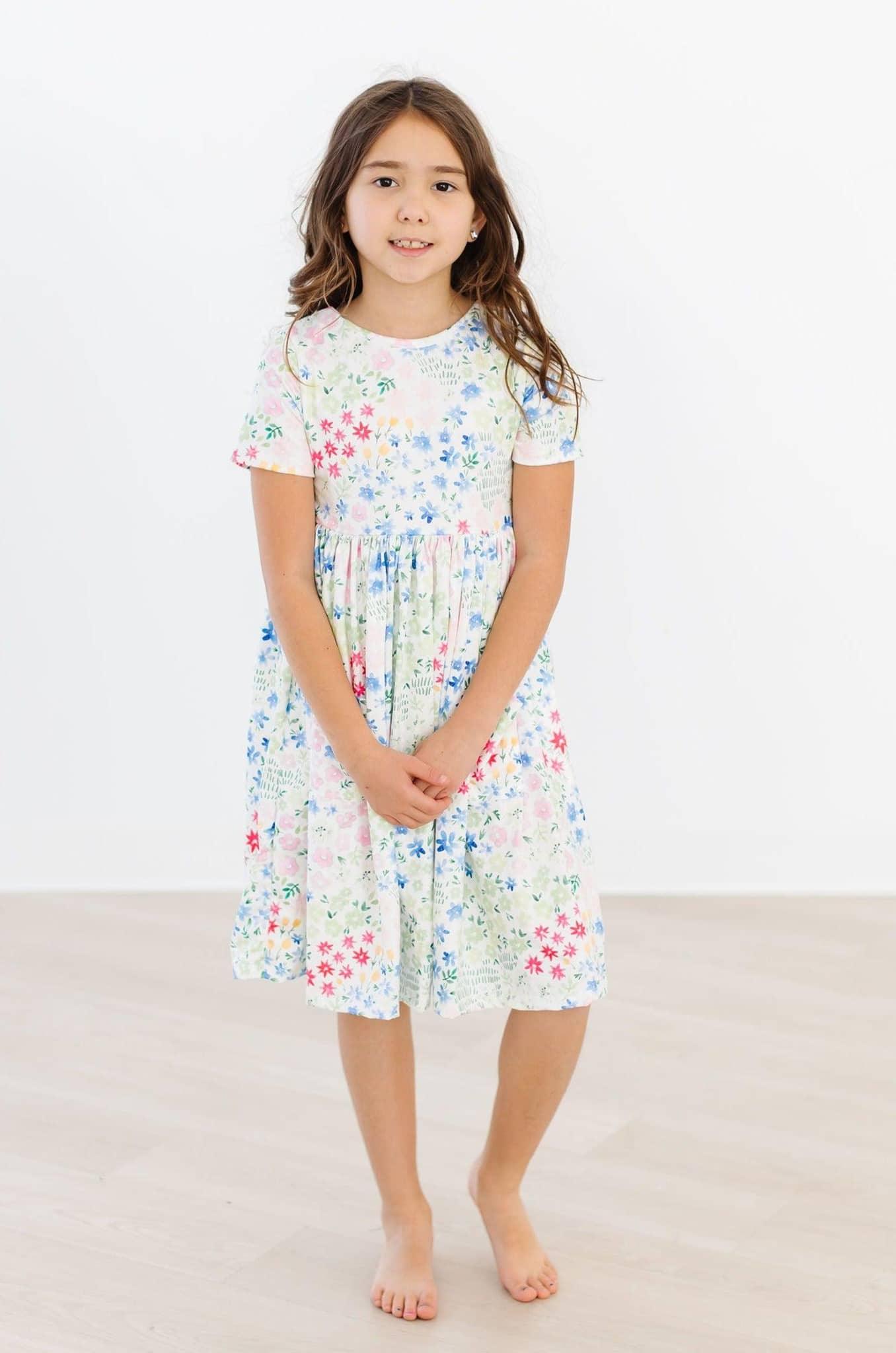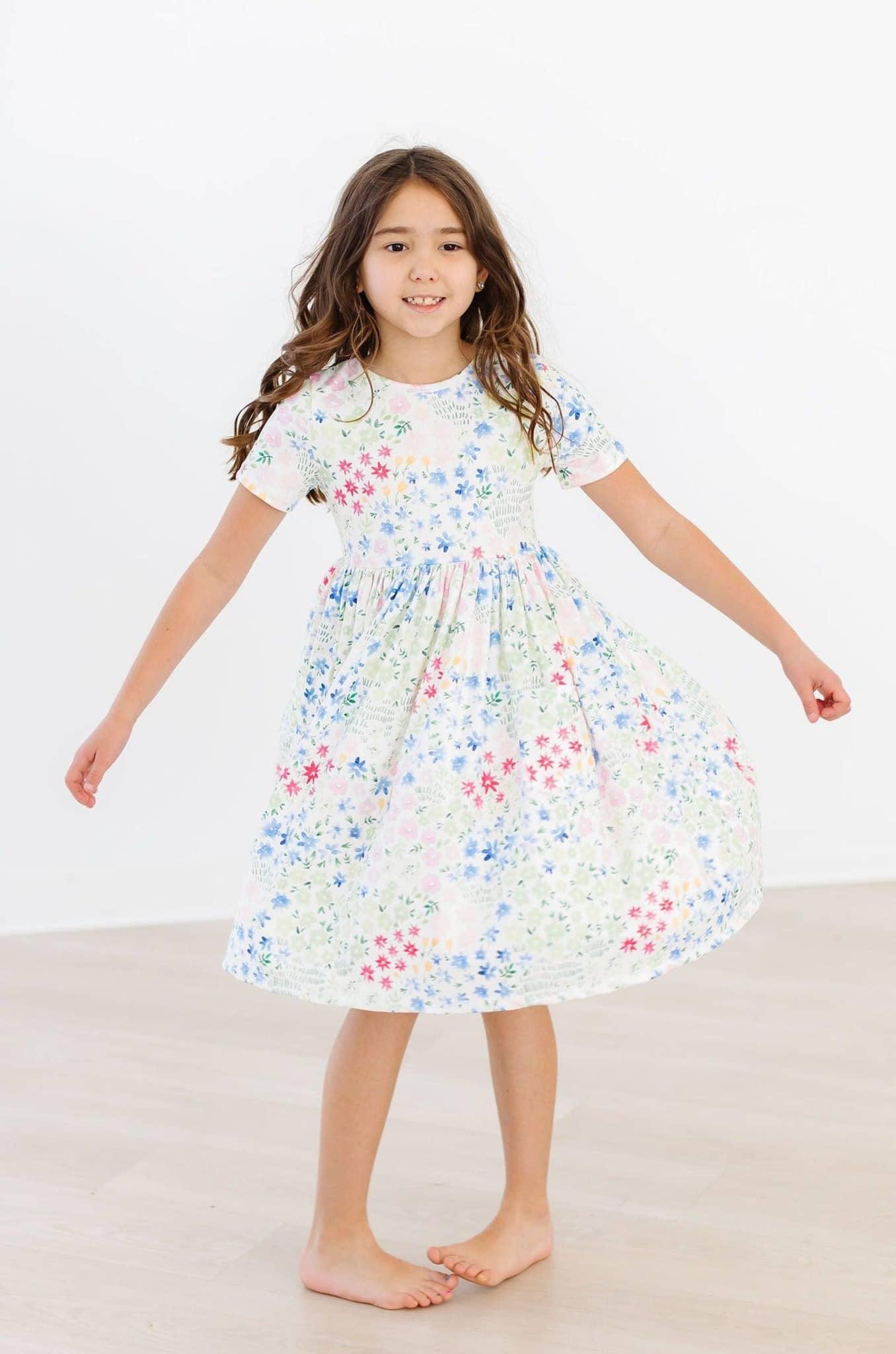 The Sunshine Meadows Short Sleeve Pocket Twirl Dress for Girls brings a fresh, playful design to your child's wardrobe. This girls floral twirl dress features a soft, lightweight fabric that keeps your little one comfortable all day. The fabric feels gentle on sensitive skin. The short sleeves make this dress perfect for warmer days and easy to layer with a cardigan or jacket when needed.
