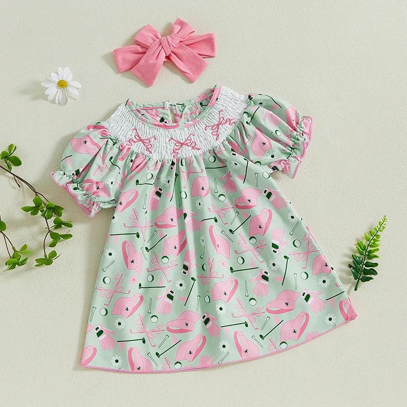 Encourage a love for golf in your little one with the fun "Golfing Sweetie" girls golf dress! This delightful green and pink dress features an adorable golf-themed print and embroidery that every young golf enthusiast will love. Complete the look with the matching headband for a perfectly coordinated outfit!