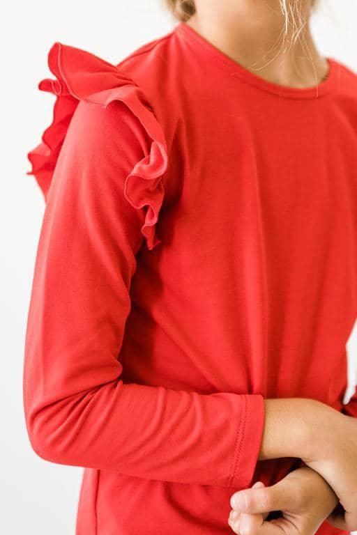Pair this sweet top with jeans, leggings, or a skirt for any occasion. Dress it up with a cute headband or go casual with sneakers. The girls red ruffle sleeve top brings comfort and style to everyday activities as well as special family events.