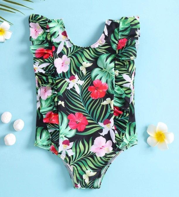 Girls Tropical One-Piece Swimsuit with Ruffle Sleeves