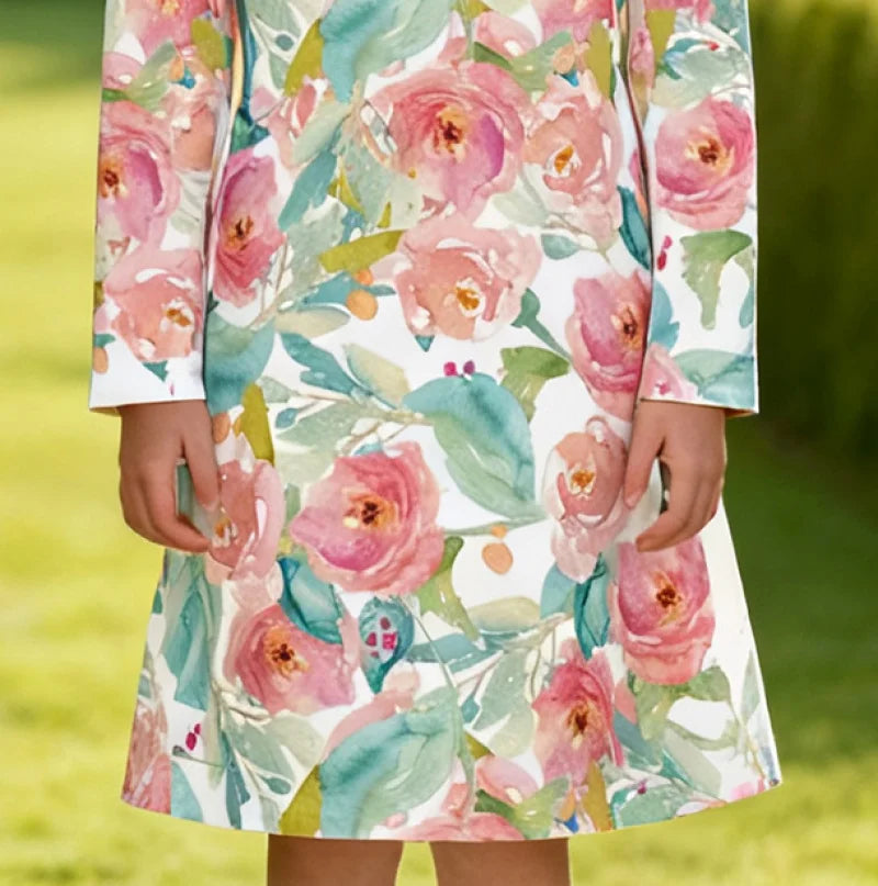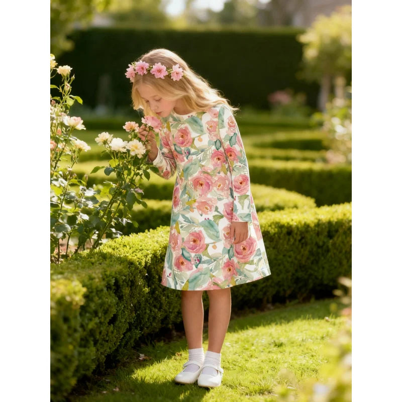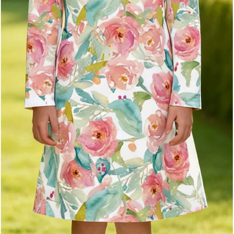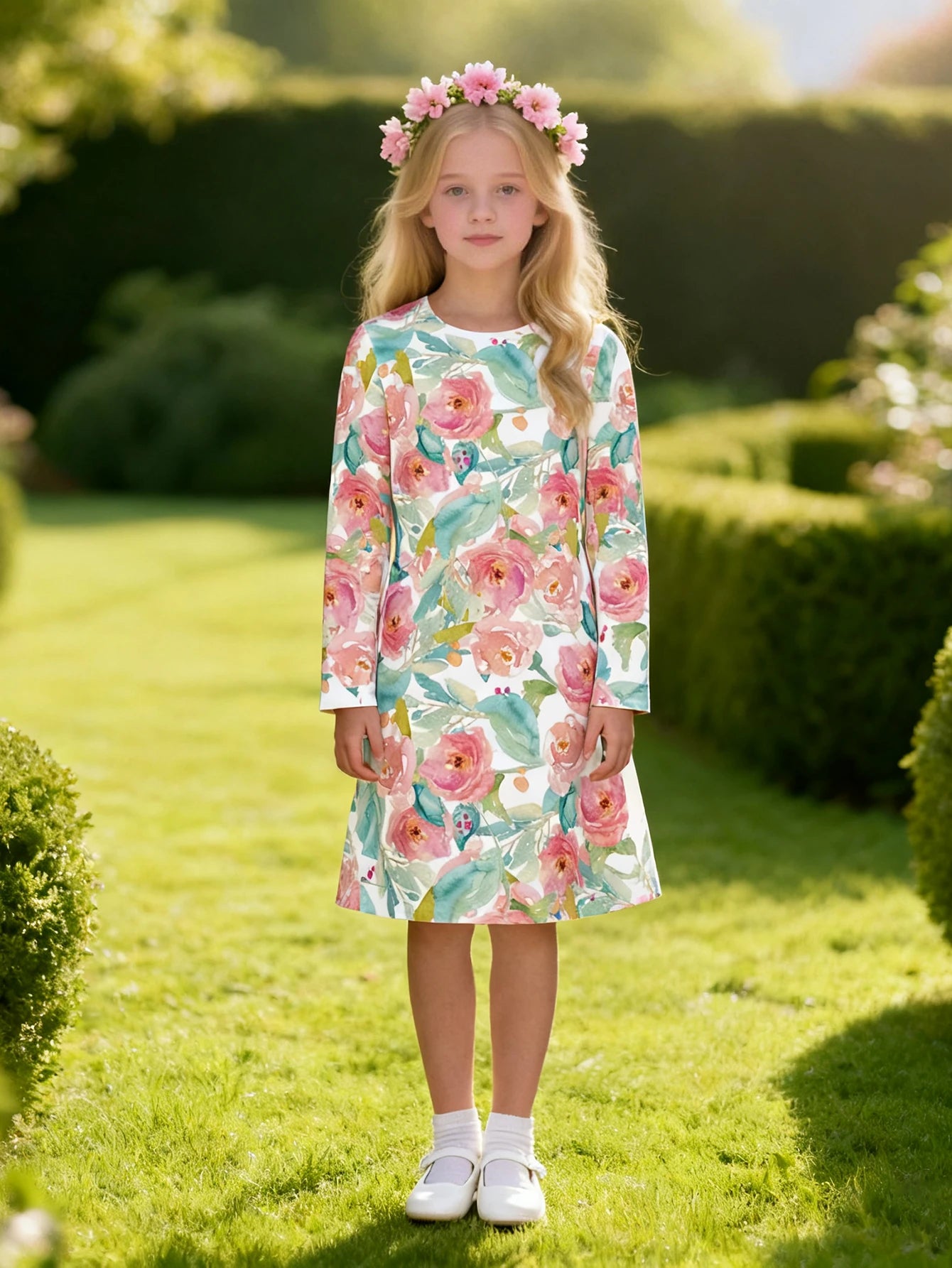 The "Hannah" dress captures timeless elegance with its enchanting watercolor rose print, designed specifically for girls ages 7-13. This thoughtfully constructed piece features a premium blend of polyester and spandex that delivers exceptional comfort and flexibility for active wear. The classic A-line silhouette flatters various body types while allowing unrestricted movement, making it ideal for both structured occasions and everyday styling. Long sleeves provide versatile layering options across seasons, while the round neckline offers a refined, age-appropriate finish.