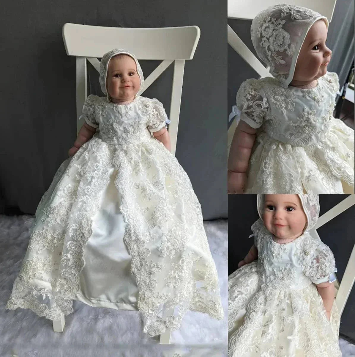 Each heirloom baby girl gown comes with a matching bonnet. The bonnet frames your little one's face in gentle lace. The puff sleeves add a sweet vintage detail. The skirt flows softly, creating beautiful movement in every photo. Designed for sensitive baby skin, each seam is smooth. No rough edges or scratchy trims.