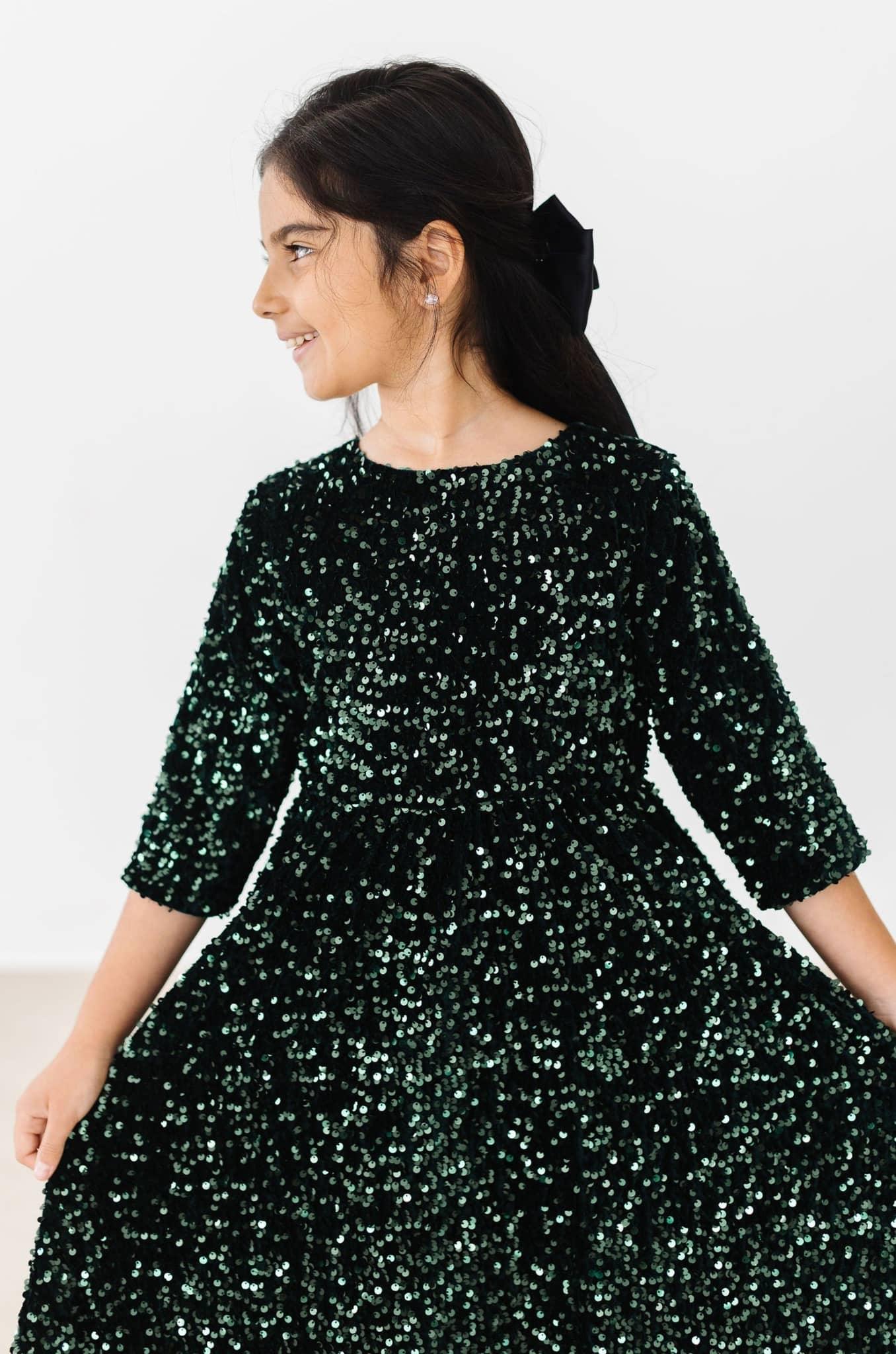 The hunter green sequin dress for girls brings confidence to every moment. Her dress sparkles under every light. She will feel beautiful and ready to twirl.