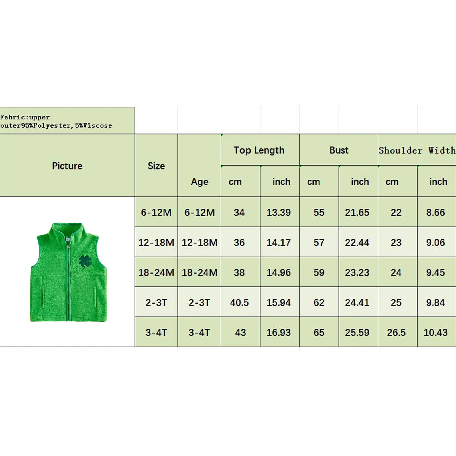 6-12M Length: 13.39 Bust: 21.65 Shoulder Width: 8.66 Advised Age: 6-12 Months