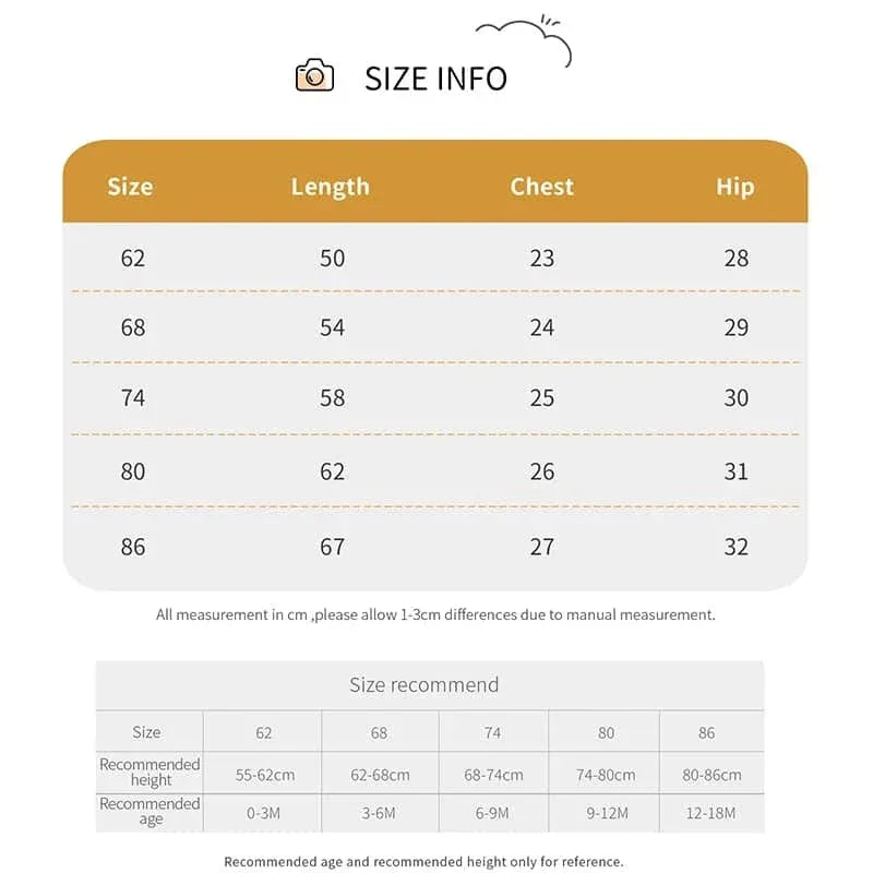 You can trust that this uncomplicated design is true to size, ensuring a great fit for your little explorer. Caring for this romper is a breeze—simply wash it in cold water and line dry to maintain its softness and shape. Remember to check the size chart to find the ideal fit for your baby.