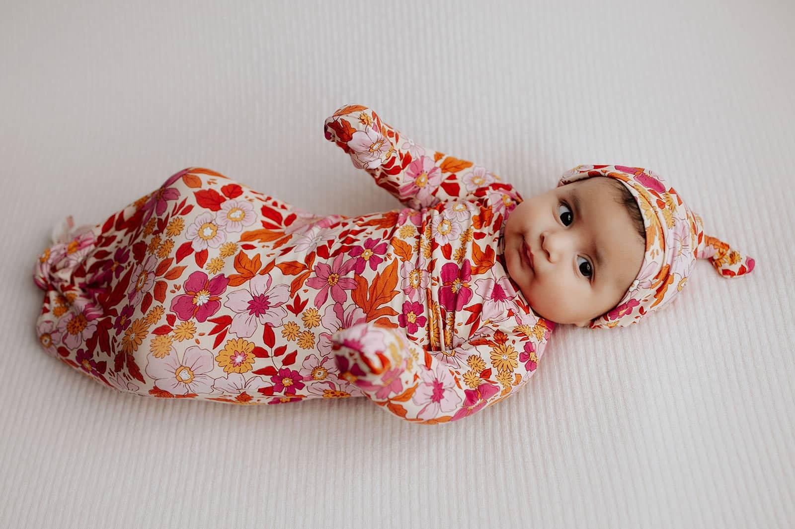 The Wild Child Knotted Newborn Baby Gown from Three Little Tots is perfect for your little one. This knotted newborn baby gown features a vibrant floral print with soft orange, pink, and white tones. The fabric is gentle and smooth, designed to keep newborns comfortable through every moment.