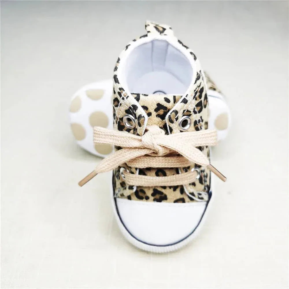 Step into style and comfort with the Canvas Lace-up Baby First Walkers in Loving Leopard! Ideal for your little explorer's first steps, these delightful soft-sole sneakers combine playful designs with practical features. Designed with a breathable canvas upper that showcases an adorable leopard pattern, these shoes are perfect for both boys and girls.