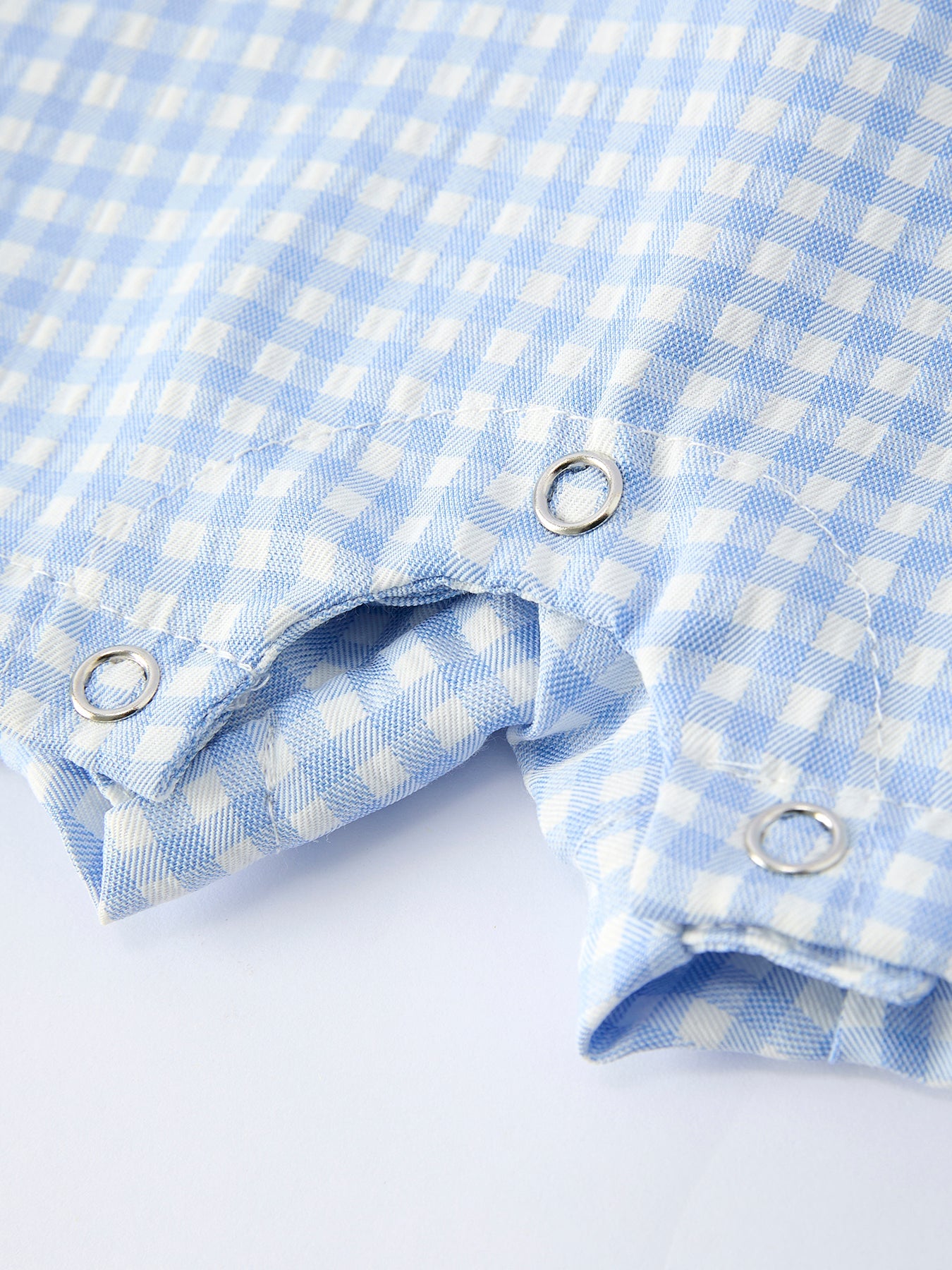 - Light blue gingham pattern with hand-smocked crocodile detail