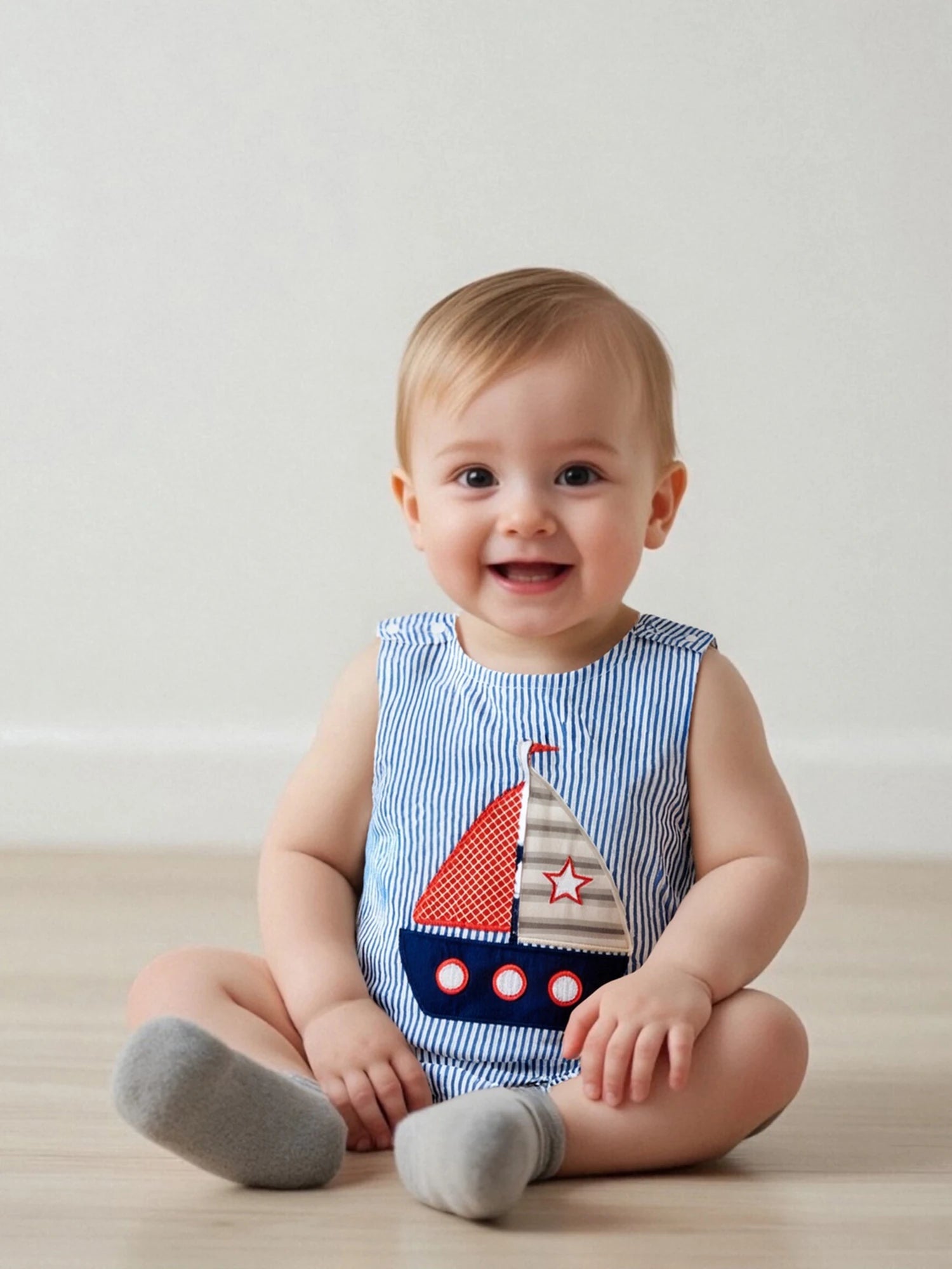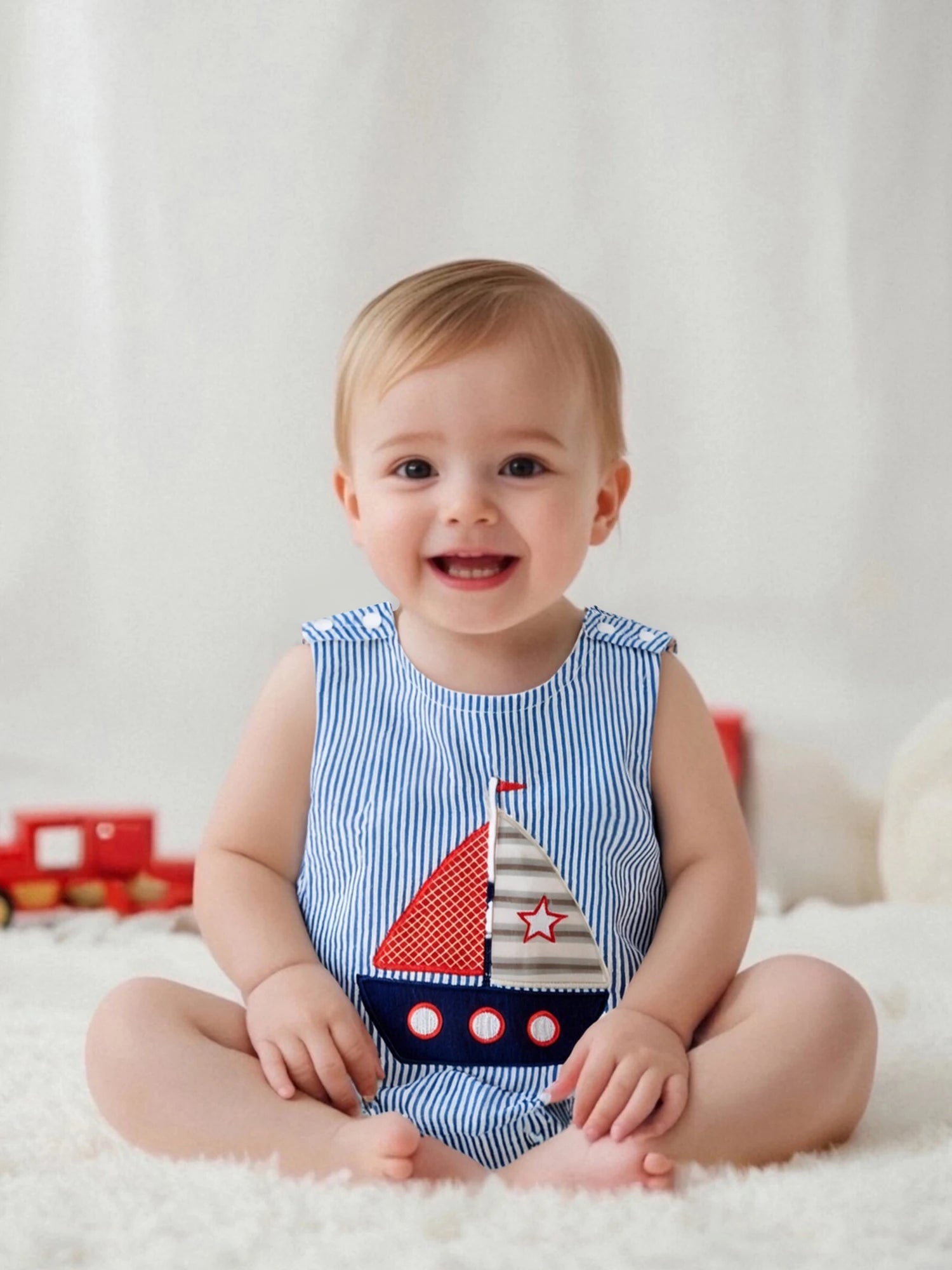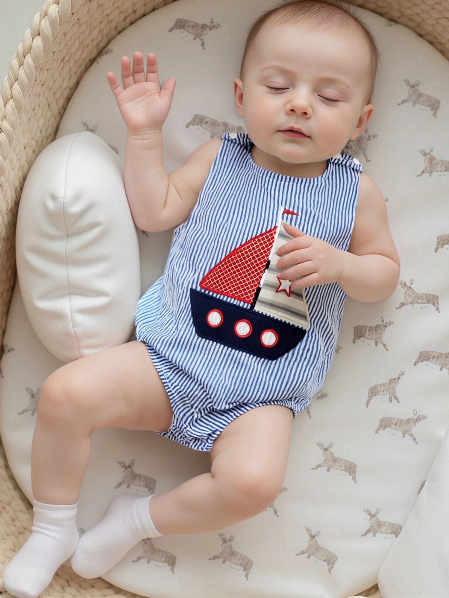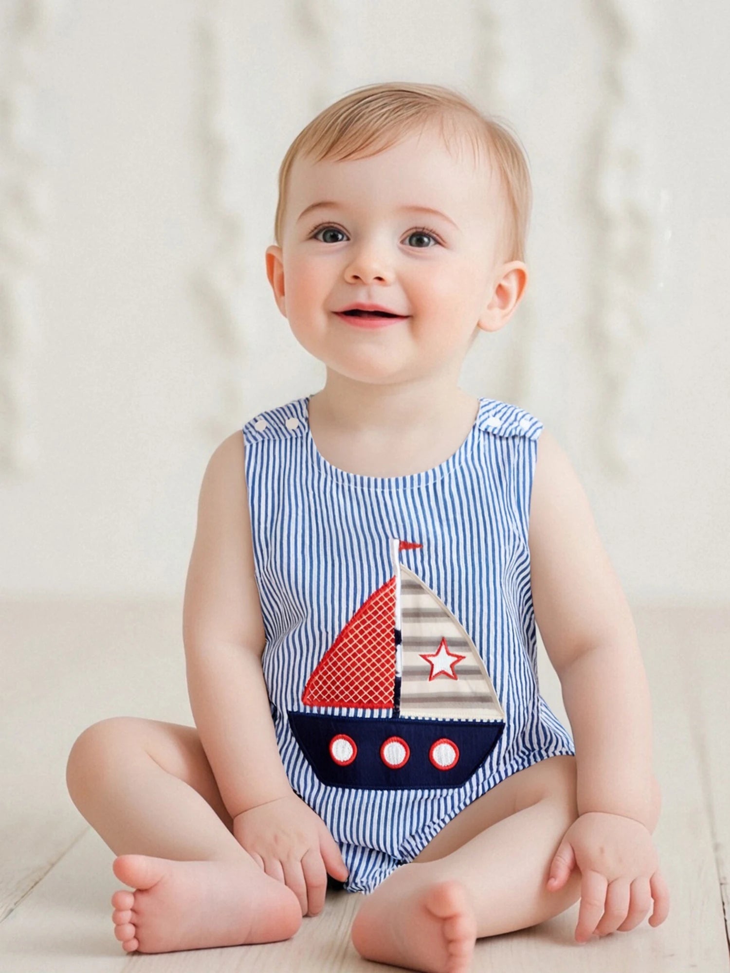 Set sail for adventure with our Little Sailboat Embroidered Sleeveless Bubble! Designed for fashionable infants aged newborn to 18 months, this charming bubble combines seaside chic with playful style. Made from premium Boca blue and Wentworth white striped seersucker, it features an adorable embroidered sailboat that ignites a love for the ocean and everything beach in both boys and girls. Perfect for beach days, pool parties, or family gatherings, this versatile romper is a must-have for your little one's wardrobe.