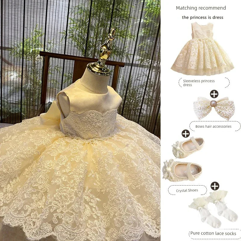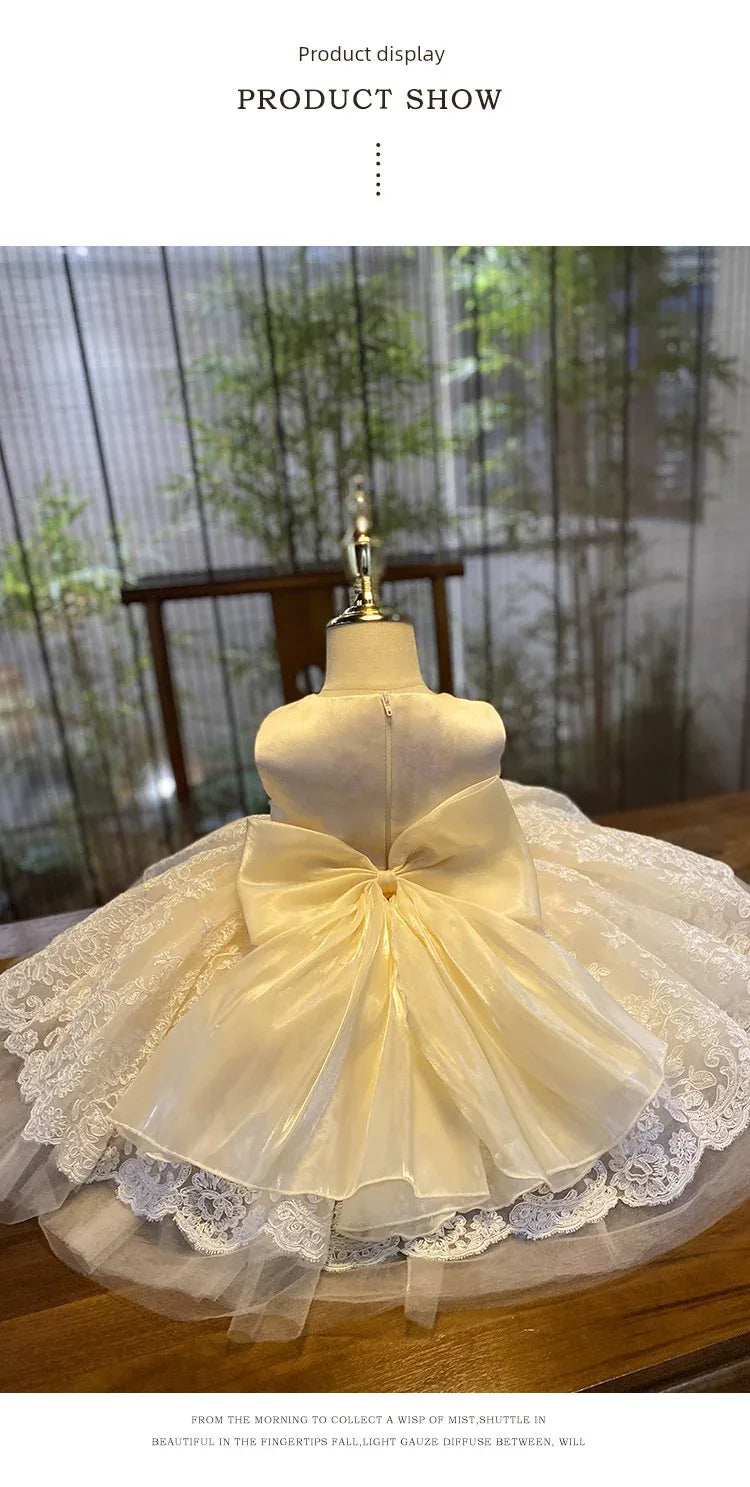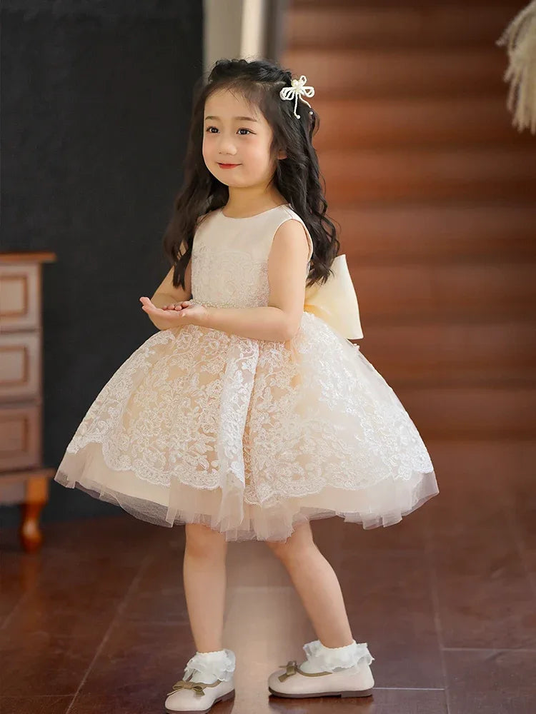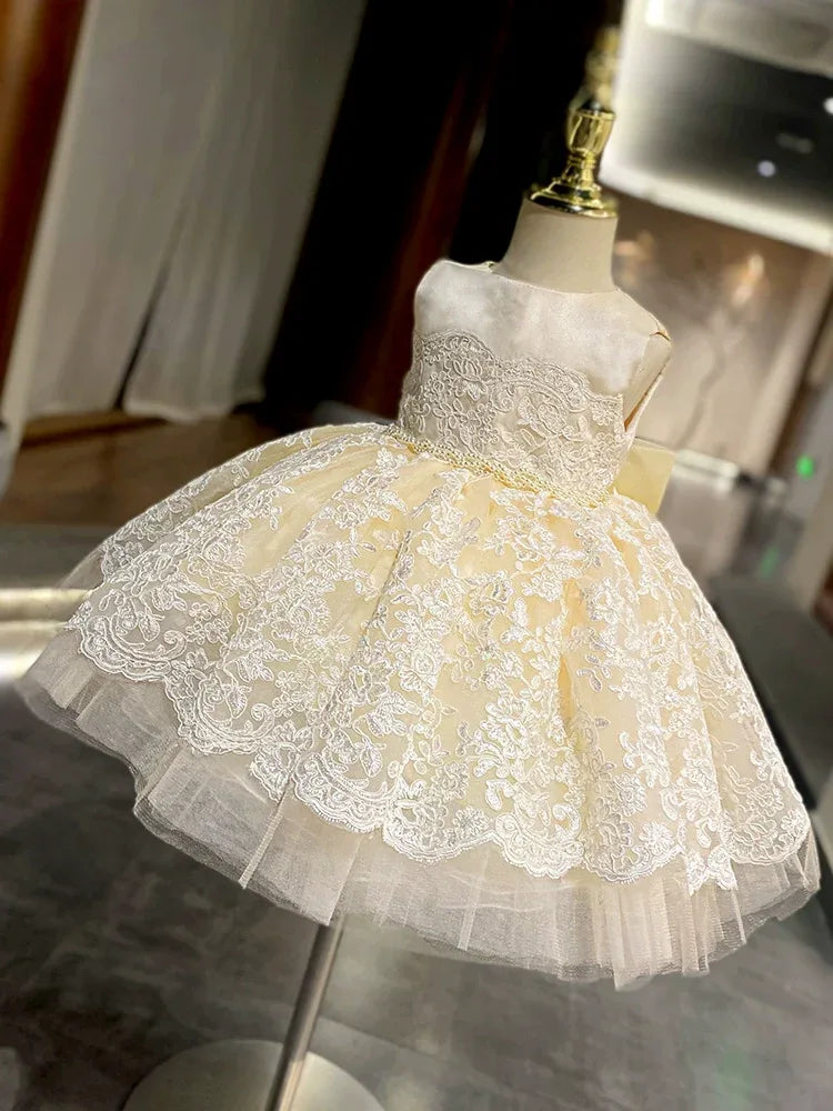 Indulge your little princess in a world of elegance with our 'Nicolette-Marie' luxurious lace dress. This exquisite garment is designed for special occasions, showcasing a breathtaking hand-beaded belt that accentuates its rich champagne hue. Perfectly suited for weddings, baptisms, flower girl attire, pageants, recitals, and other formal events, this dress promises to turn heads and capture hearts.