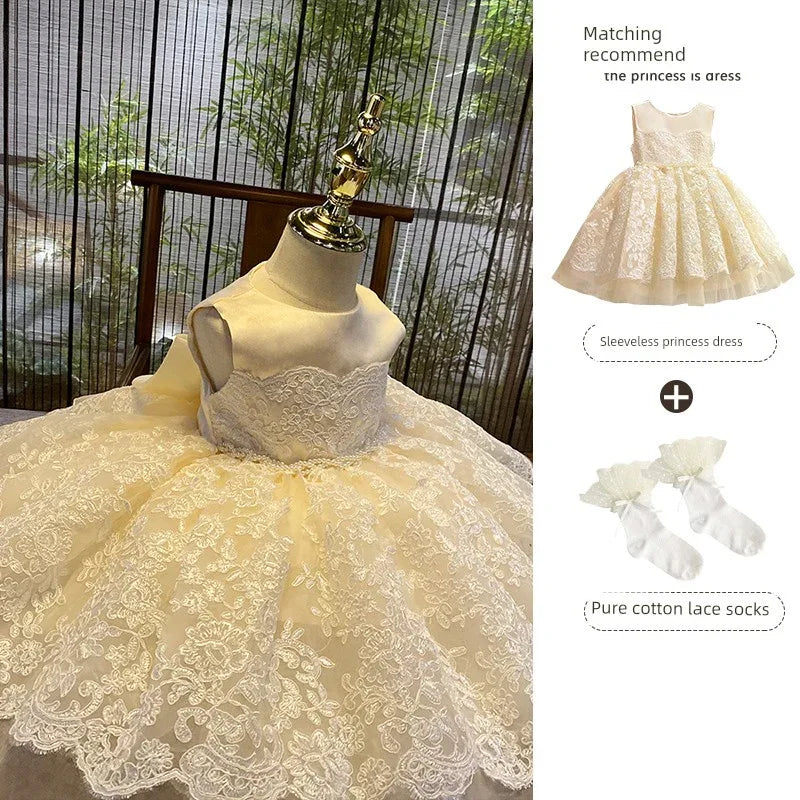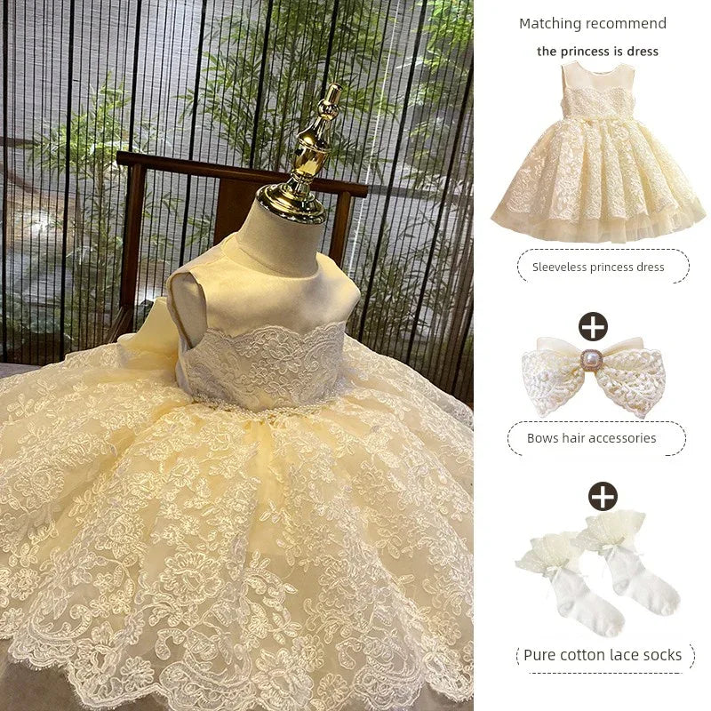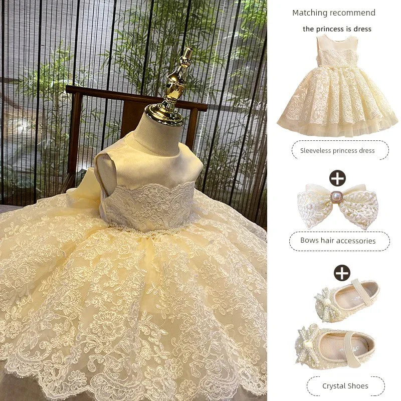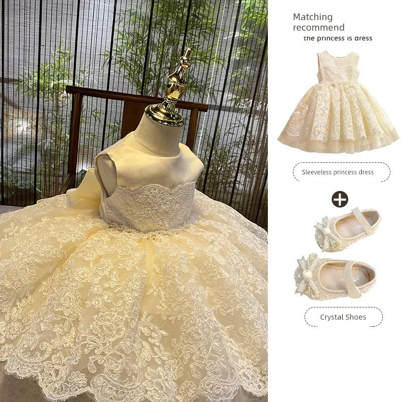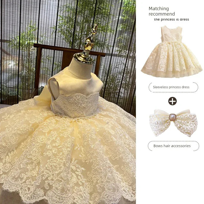 Indulge your little princess in a world of elegance with our 'Nicolette-Marie' luxurious lace dress. This exquisite garment is designed for special occasions, showcasing a breathtaking hand-beaded belt that accentuates its rich champagne hue. Perfectly suited for weddings, baptisms, flower girl attire, pageants, recitals, and other formal events, this dress promises to turn heads and capture hearts.