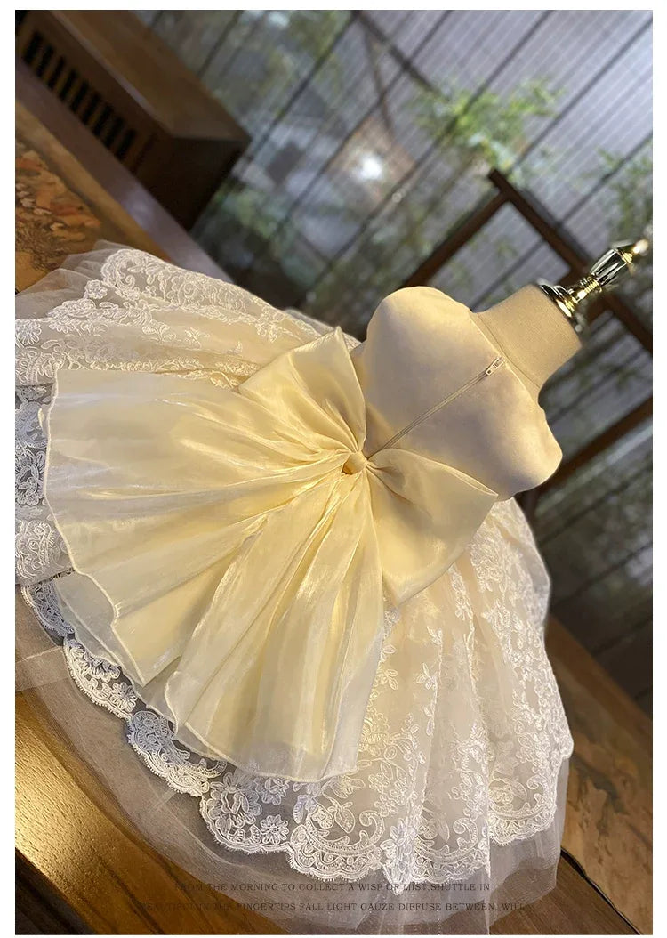 Crafted with attention to detail, the "Nicolette-Marie" features delicate satin bows and intricate lace and tulle that create an ethereal look, while the fitted bodice and layered skirt offer a flawless silhouette. This luxurious lace dress is designed for young girls aged 4 to 7 who appreciate sophisticated style, making it an ideal choice for those cherished memories.