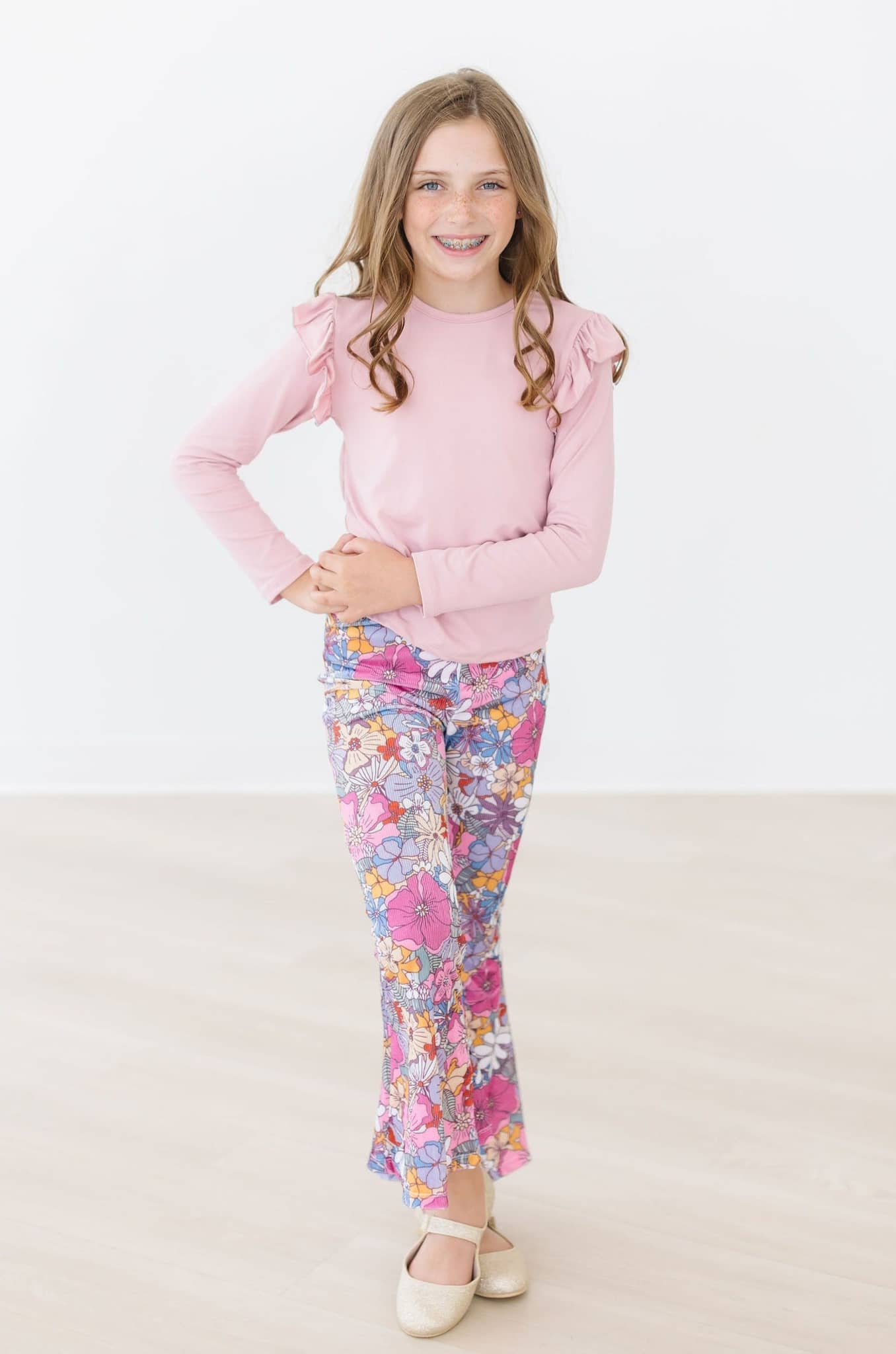 Discover true comfort and style with the mauve ribbed velvet bell bottoms from Mila & Rose ®. These pants are soft and gentle for delicate skin. The ribbed velvet fabric feels plush. It adds a cozy touch to any outfit. The chic high waist gives a stylish shape that looks great on all kids.
