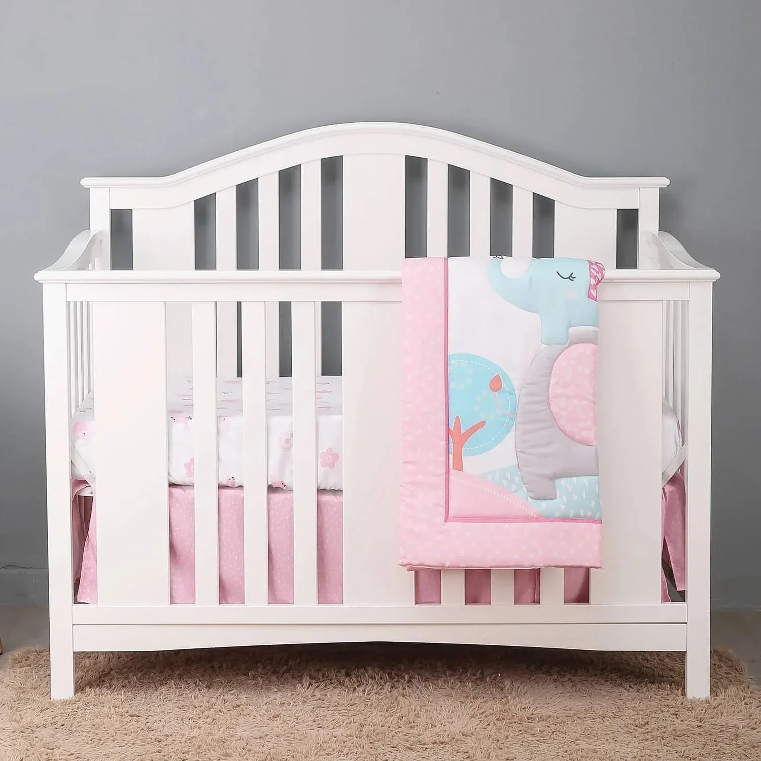 The playful elephant design adds cheerful style to your nursery crib bedding set. Soft, gentle fabrics keep your baby cozy all night. The set fits standard cribs and is designed for everyday use. Use the nursery crib bedding set for your own nursery or as a thoughtful shower gift.