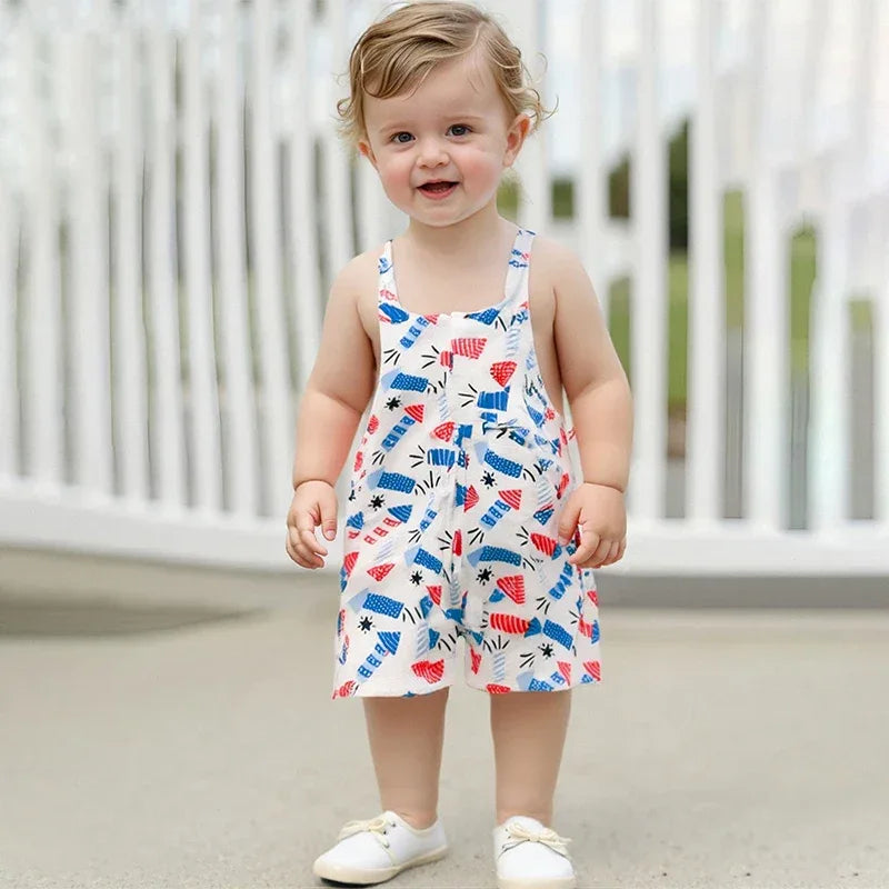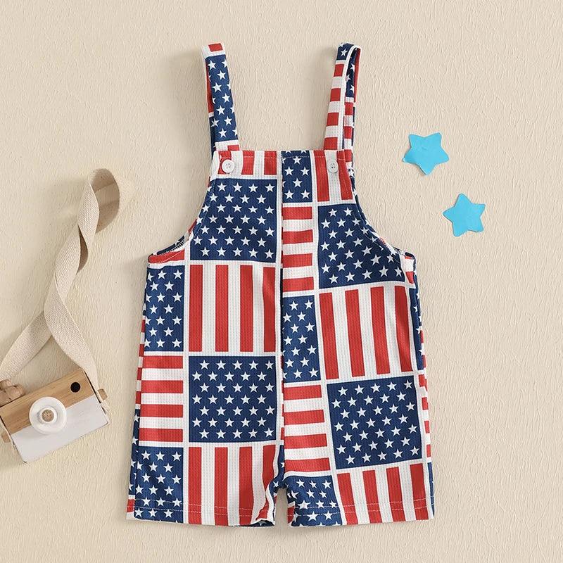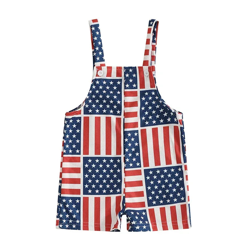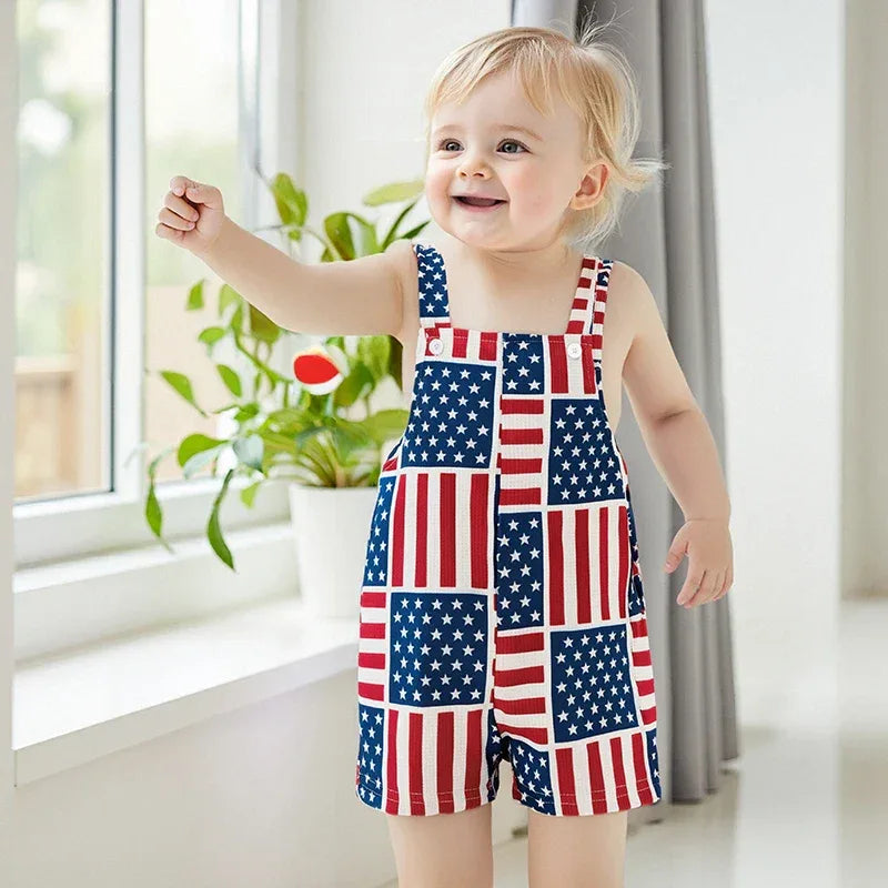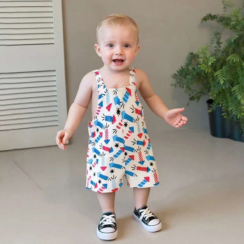 Care is easy with these patriotic baby overalls. Machine wash with cold water and tumble dry low for best results. The vibrant prints stay bright after many washes. This outfit looks cute solo on hot days or layered with a plain tee on cooler evenings. Ideal for family barbecues, holiday parades, gift-giving, and daily playtime.