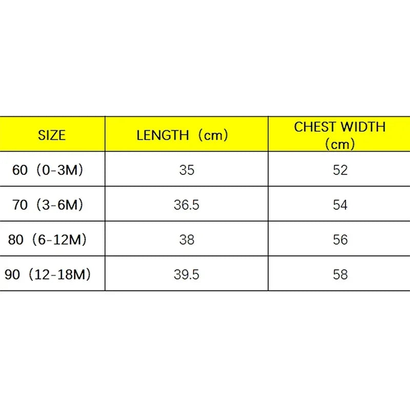 Size(inches) 0-3M Length: 12.99 Bust: 20.47 Hip: 21.26 Advised Age: 0-3 Months 3-6M Length: 13.98 Bust: 21.26 Hip: 22.05 Advised Age: 3-6 Months 6-12M Length: 14.57 Bust: 22.05 Hip: 22.83 Advised Age: 6-12 Months 12-18M Length: 15.55 Bust: 22.83 Hip: 23.62 Advised Age: 12-18 Months