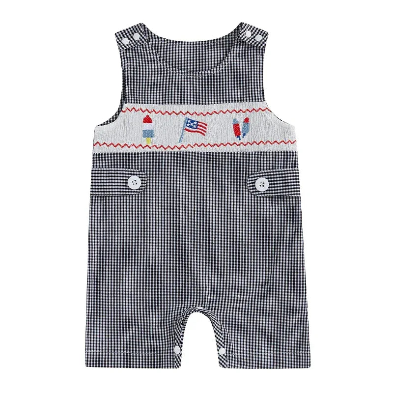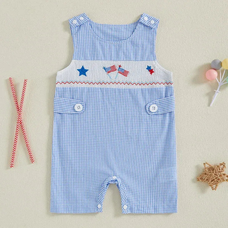 Introducing the "Red, White, and Blue Cutie" Patriotic Baby Romper - a symbol of American pride. Adorned with a beautifully embroidered flag and stars, this romper is a must-have for any baby boy or girl. Available in blue and white or gray and white checks, its round neckline and sleeveless design add a touch of casual charm. With functional button details and convenient snaps at the legs, diaper changes are a breeze. Crafted from easy-care, wrinkle-resistant polyester, this romper is perfect for summer days spent at the beach, pool, or gatherings with family and friends. Available in sizes for newborns through 18 months, it's a thoughtful gift for any occasion and a must-have for patriotic celebrations and 4th of July parties. For cooler days, pair it with a top and cardigan - versatility at its best. Grab your "Red, White, and Blue Cutie" Romper now and show your love for the red, white,