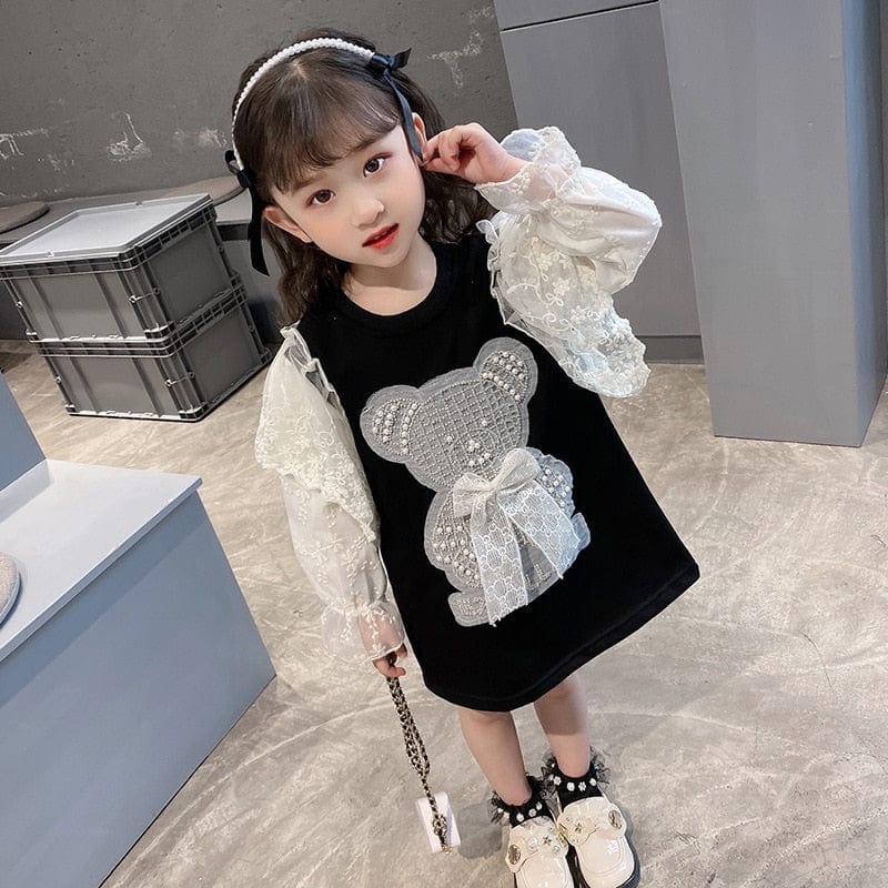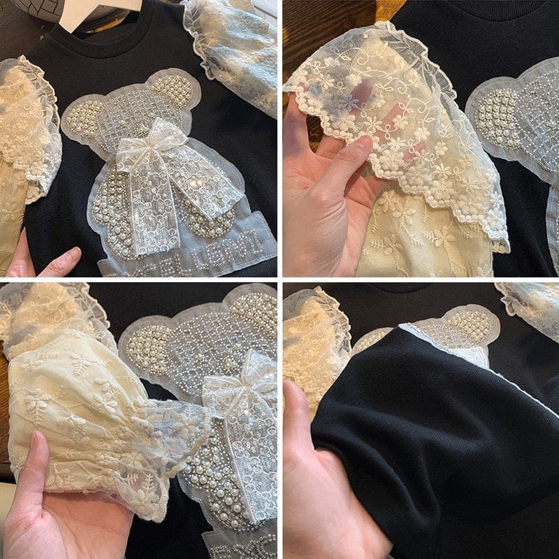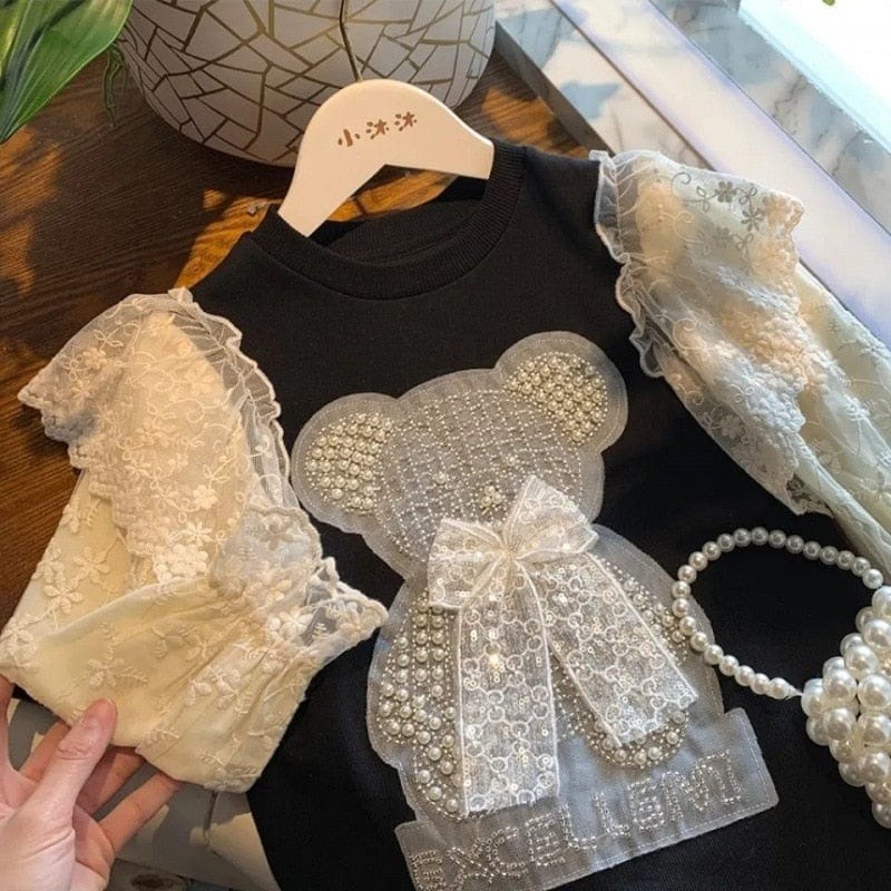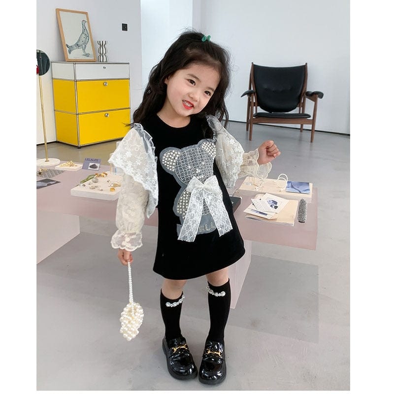 Pearl Lace Childrens Dress Black Puff Sleeves Pearls