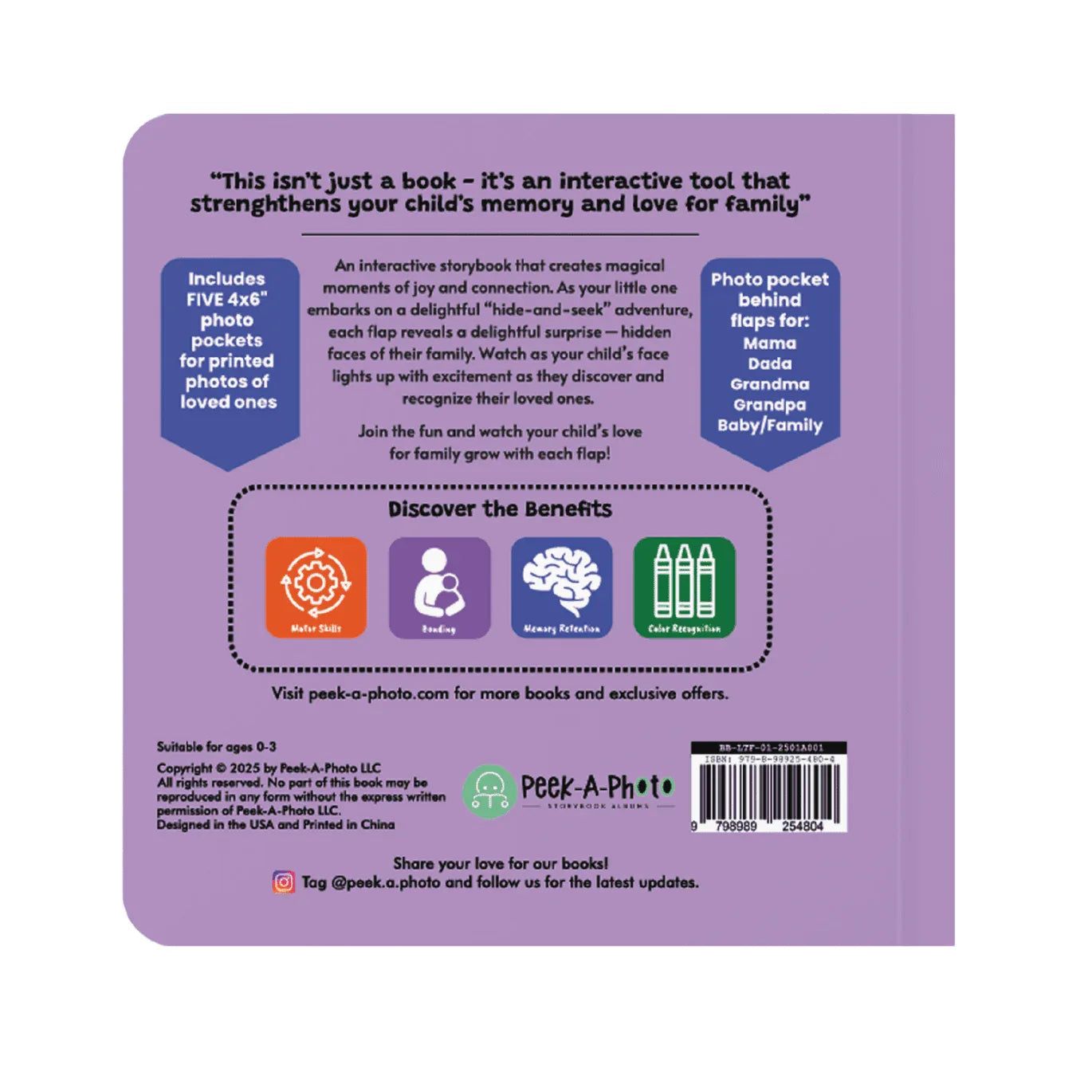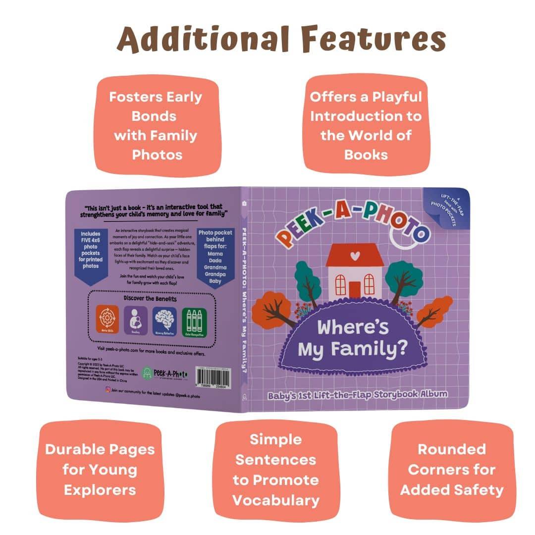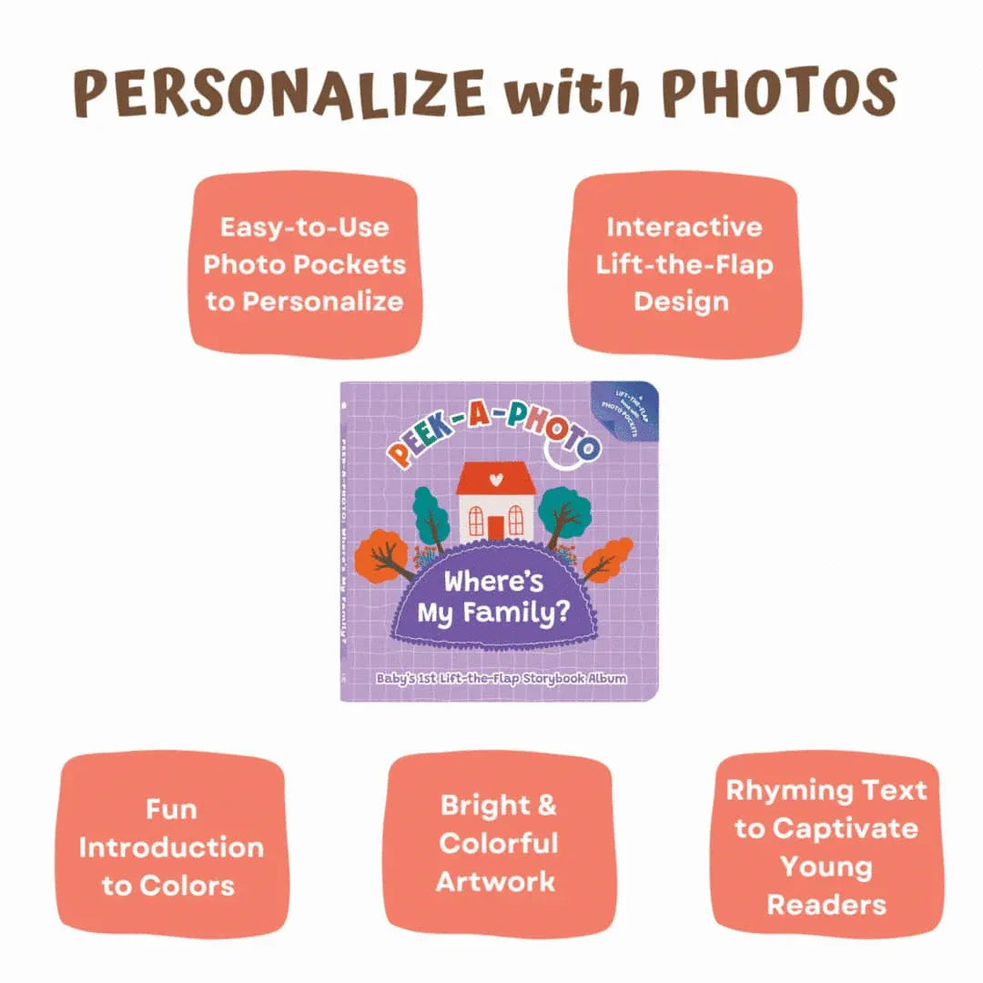 Discover the magic of connection with the "PEEK-A-PHOTO - Where's My Family?" interactive book. This personalized baby photo book is designed to help little ones learn about loved ones. Each page features a lift-the-flap design, turning story time into a fun and educational activity.