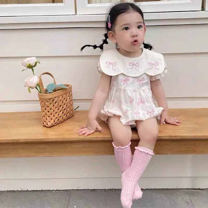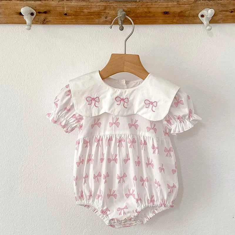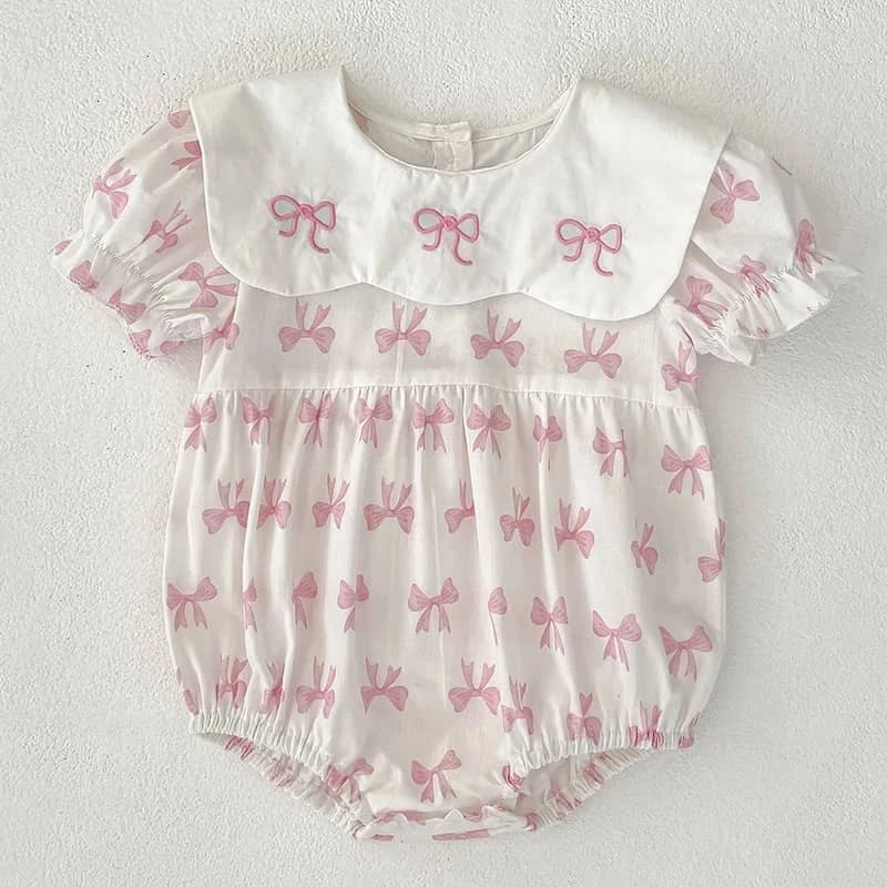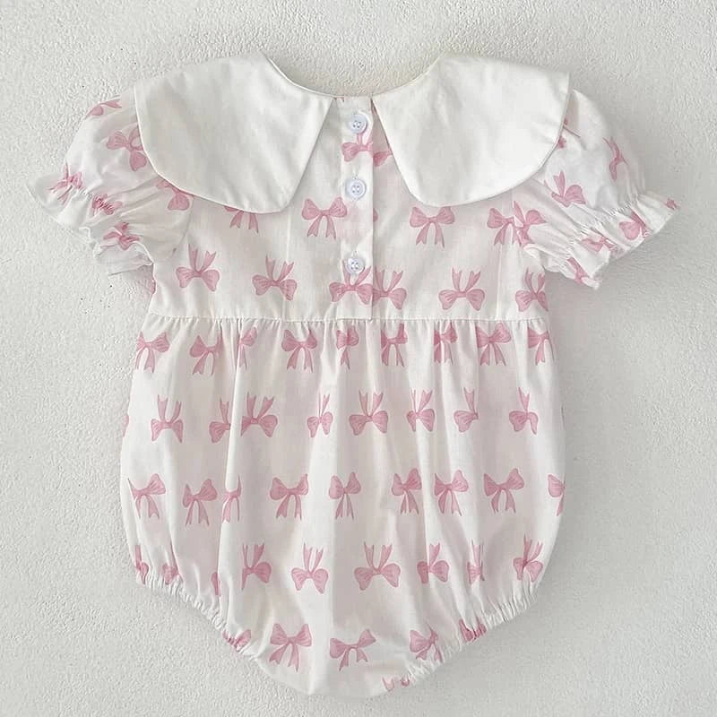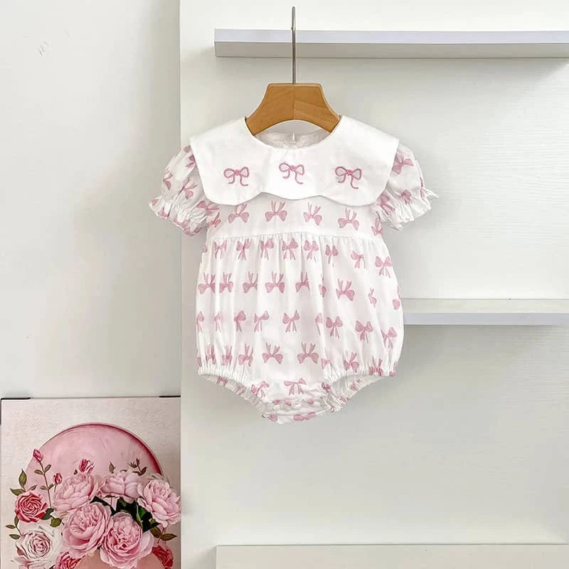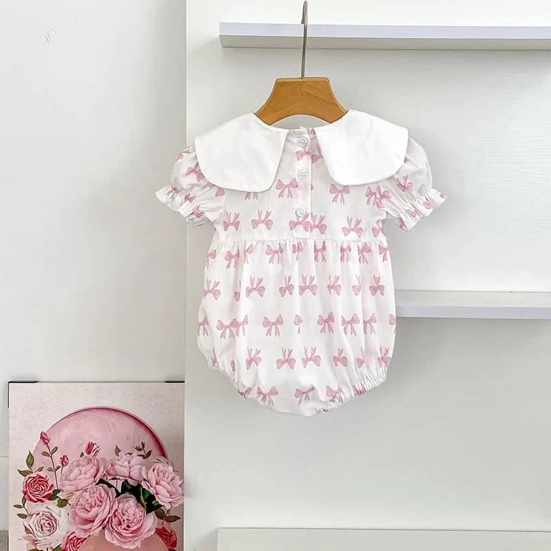 Dress your baby in charming style with this pink baby bubble romper with lace collar. The soft pastel pink color gives a sweet look. Delicate bows cover the fabric for a playful vibe. The main highlight is the beautiful lace collar, which makes the outfit perfect for special days or casual outings.