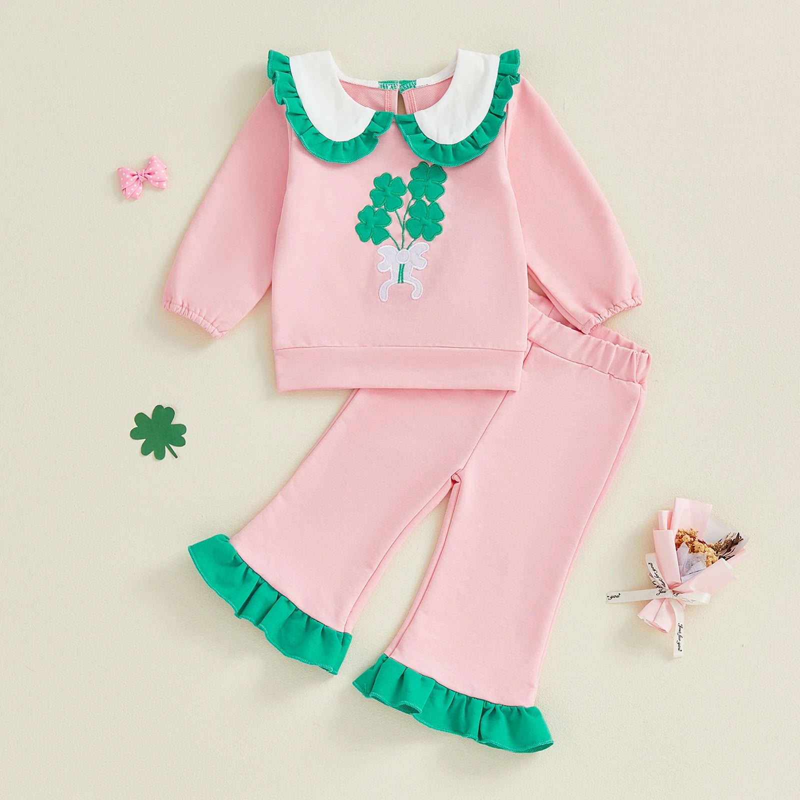 'Clover Cutie' Pink Clover Baby Girl Pants Set With Ruffle Details