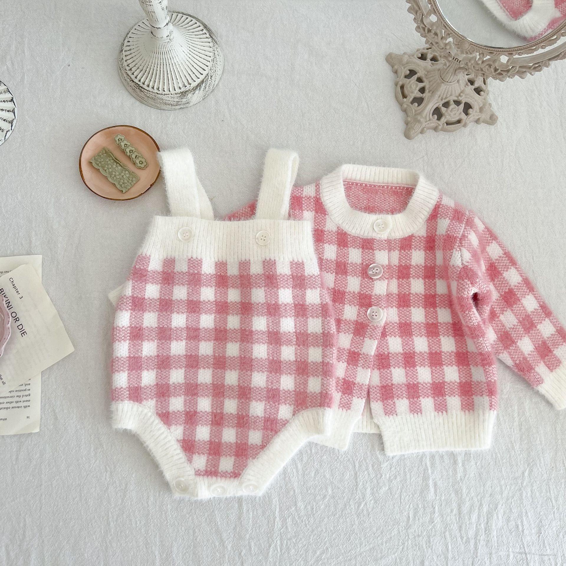 Looking for an adorable outfit that will leave your little munchkin looking effortlessly stylish? Look no further than our pink knitted romper! This charming pink-checked romper, combined with its matching sweater, brings a whole new level of cuteness for kids 3 months through 3 years. Perfect for playdates or family gatherings, your baby will surely gather compliments like it's their job!
