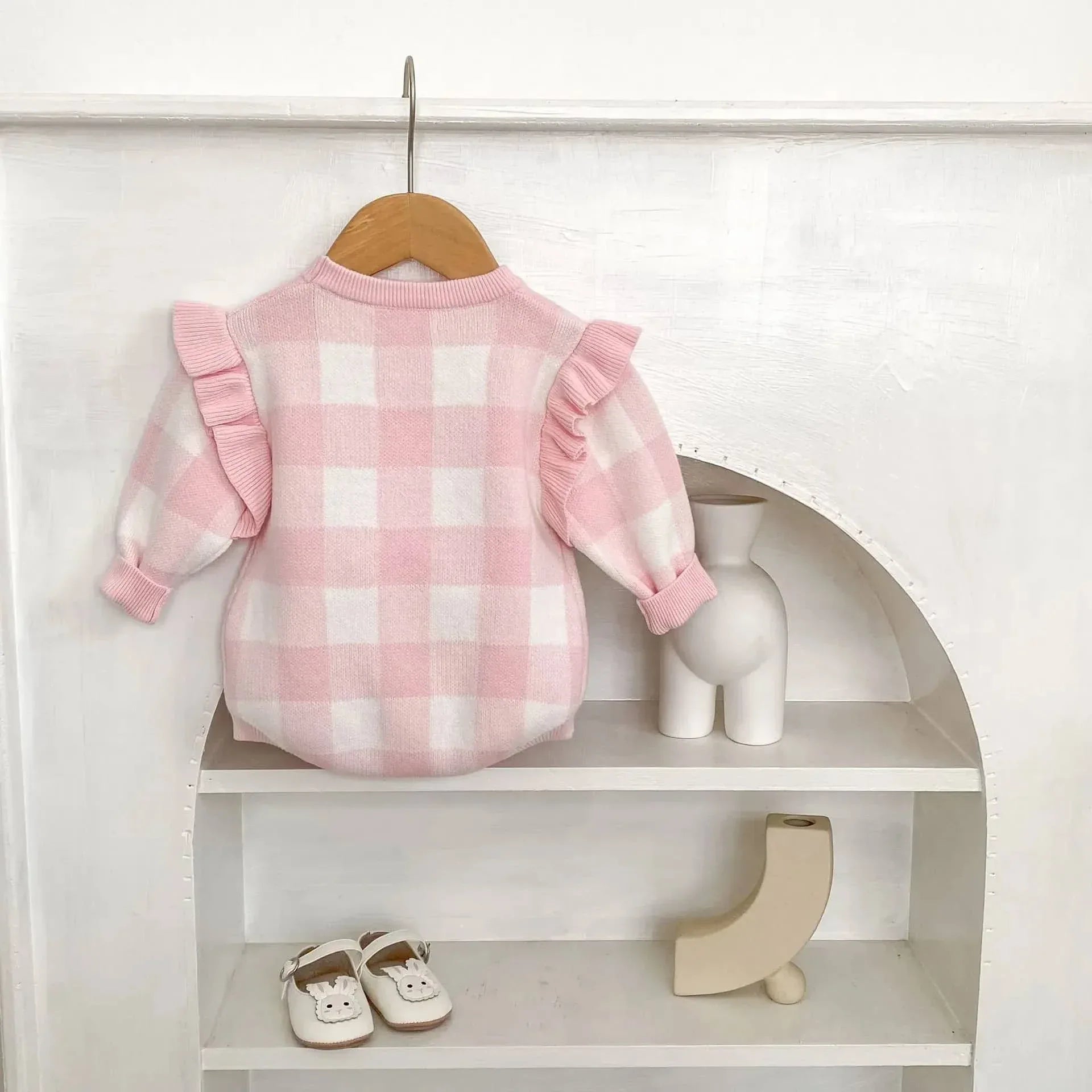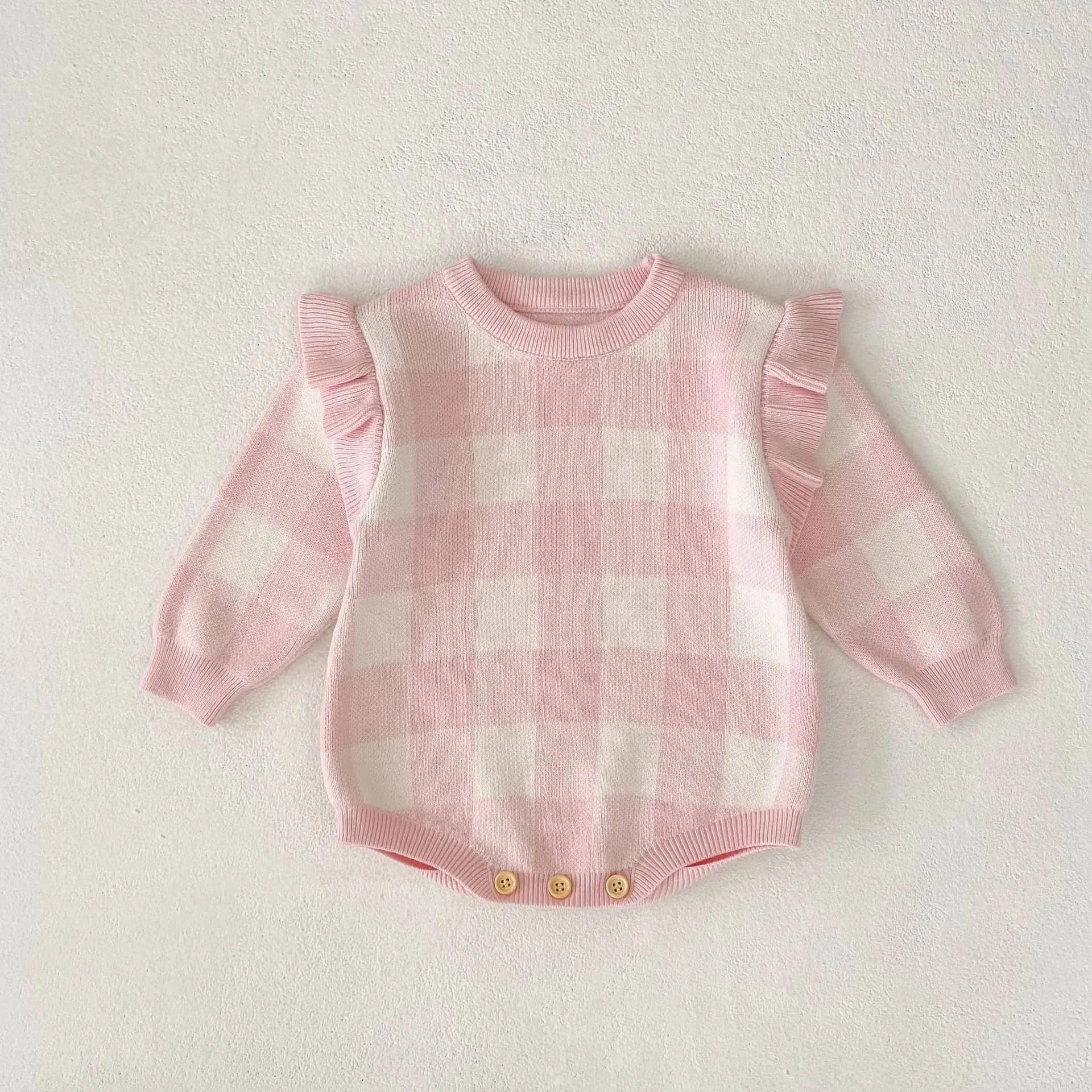 Pretty in Pink Plaid Baby Romper Knit Ruffle Sleeve Casual