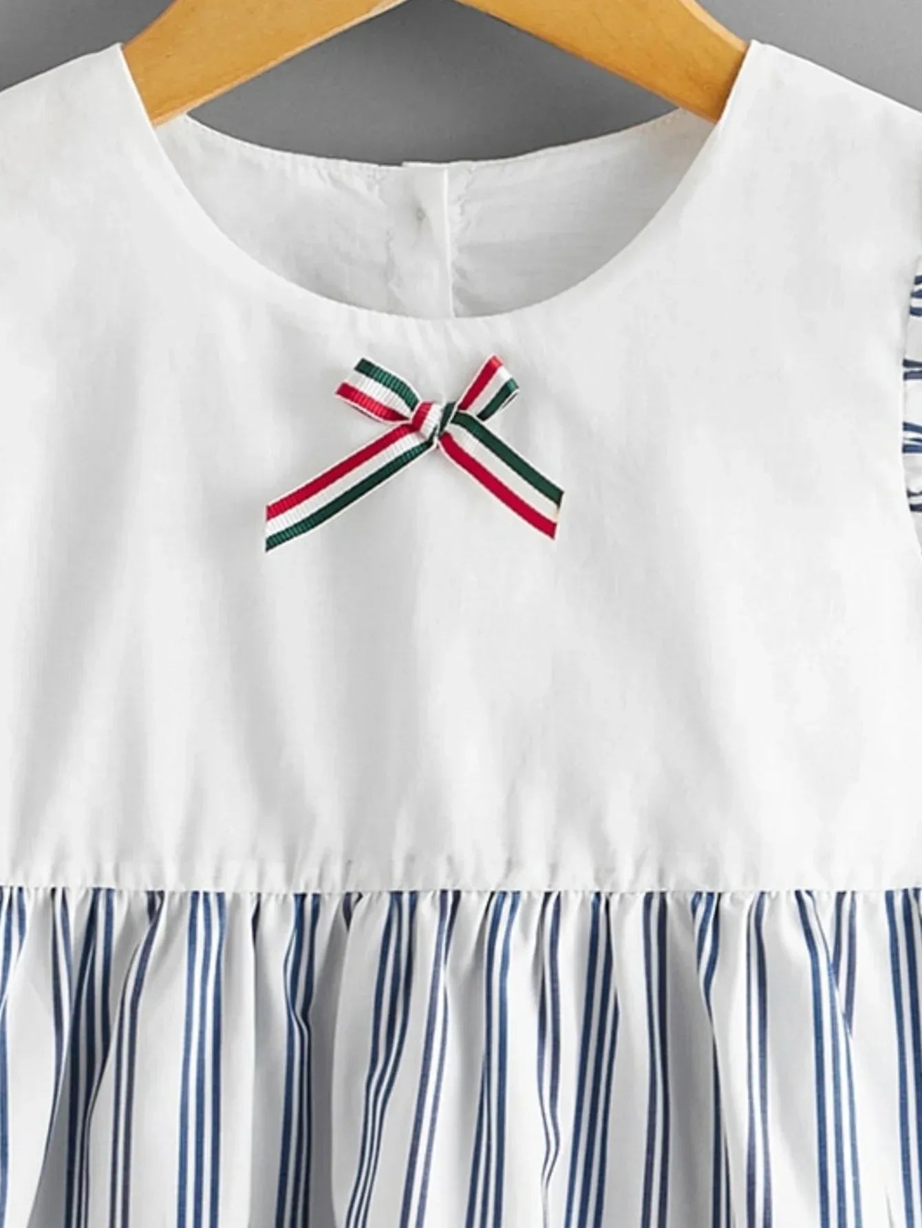 At the heart of this dress is a charming patriotic bow, showcasing red, white, and blue hues that make it an ideal choice for festive occasions. The delightful ruffled sleeves add a touch of whimsy, making it a must-have for casual outings and special celebrations alike.