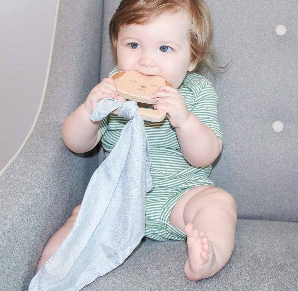 Soothe and comfort your little one with the puppy wooden teether and blue blankie set. This adorable duo calms gums and offers gentle snuggles on-the-go.