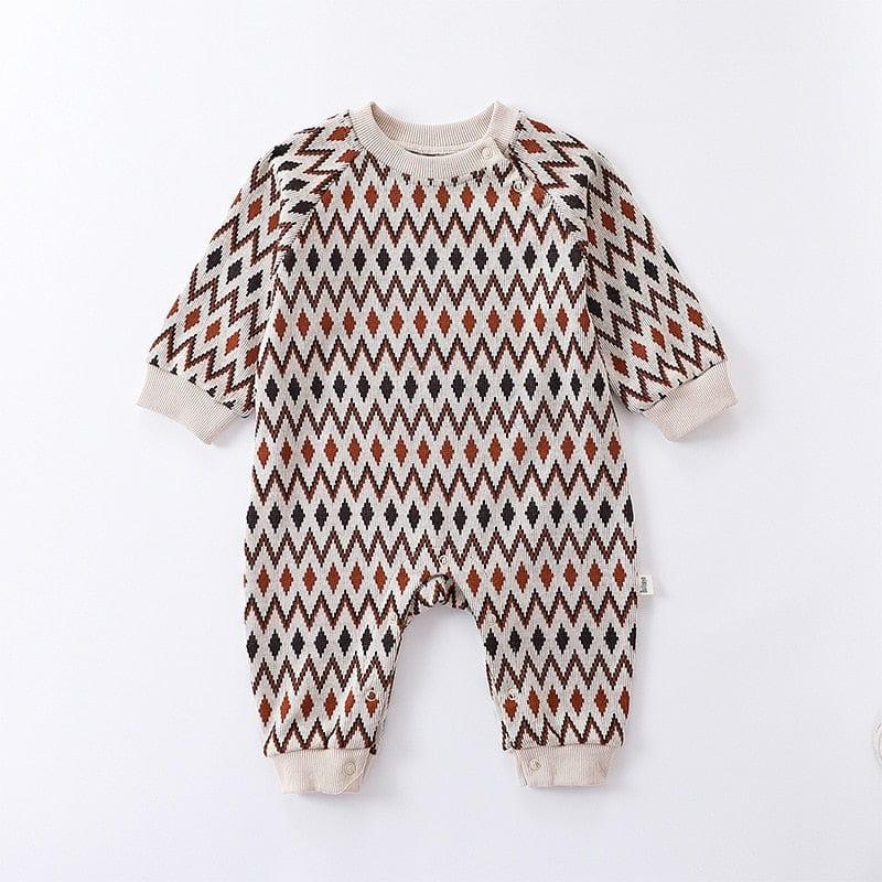 Crafted from durable polyester, this long sleeve baby romper ensures comfort that lasts all day long. The unique flame and diamond-patterned design is highlighted in beautiful earth brown tones, making it an attractive choice for any occasion.