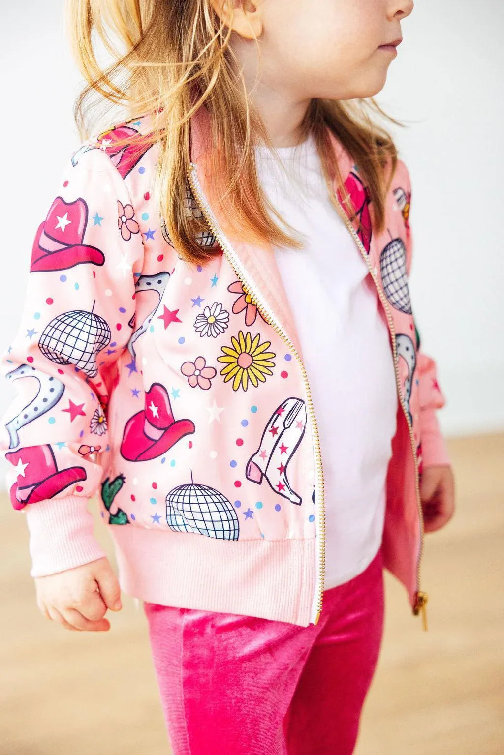 The Boots & Bling Satin Jacket for girls is the ultimate accessory for fashionable little trendsetters! This stylish satin jacket adds a pop of glam to any outfit, whether paired with a playful twirl dress, chic leggings, or a stylish skirt. Perfect for lightweight layering, it is the essential piece your little girl needs in her wardrobe.