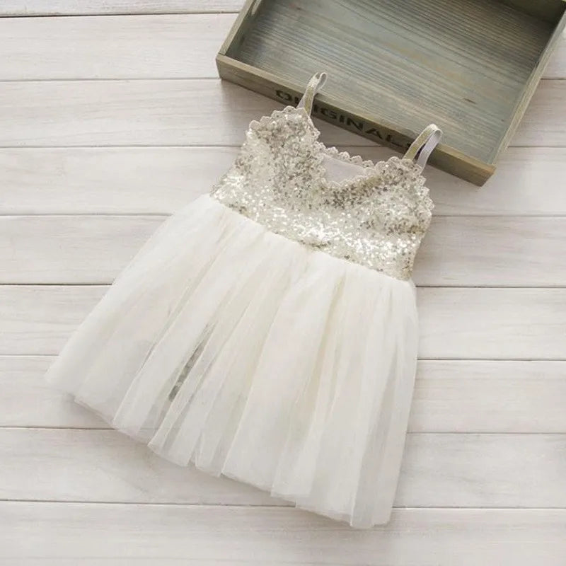 Say hello to the "Sequined Sweetie" Tulle Party Dress! This enchanting outfit is the perfect pick for your little one's next big event. With its splendid creamy beige tulle tutu, this dress adds a touch of whimsy to every celebration, transforming your child into the star of the show.