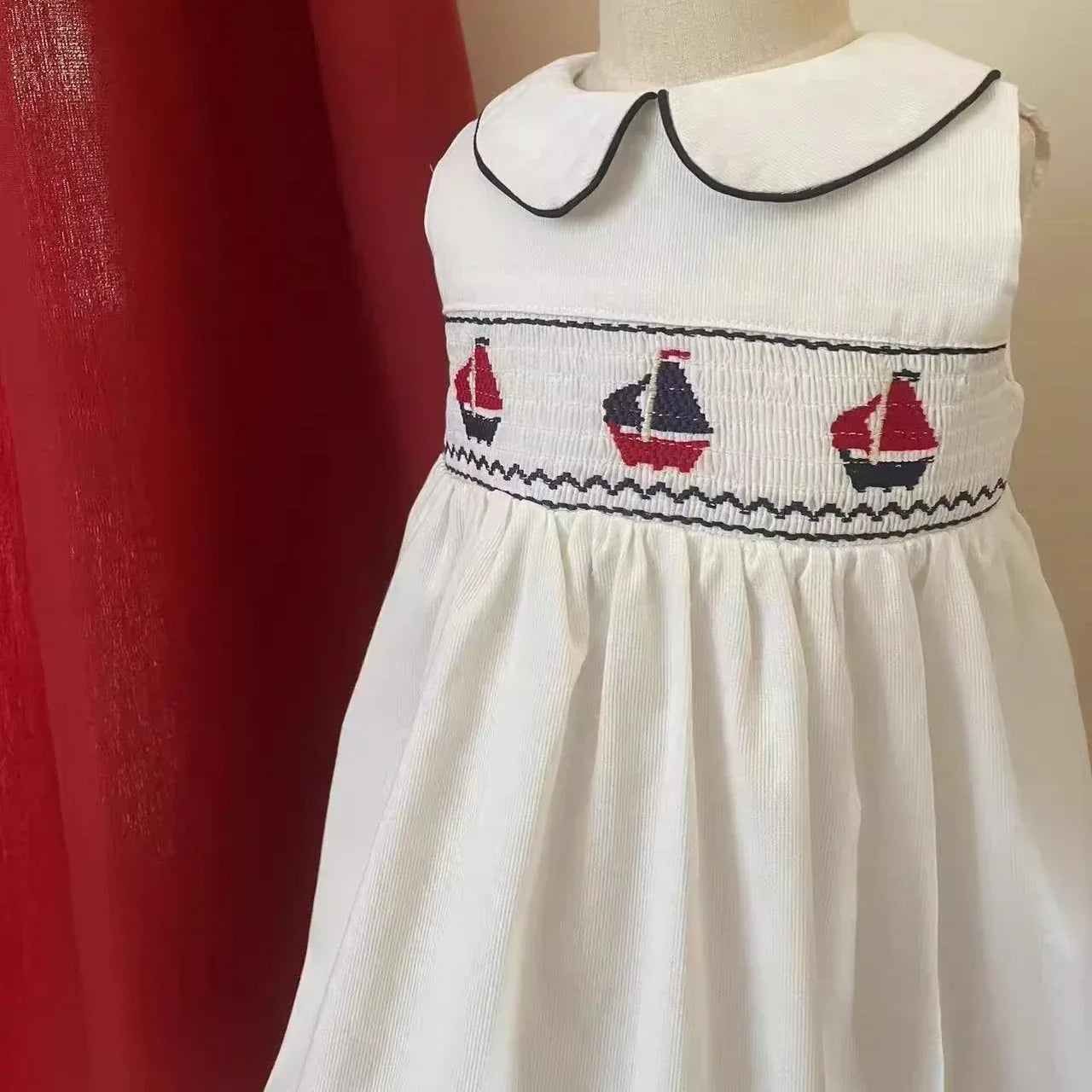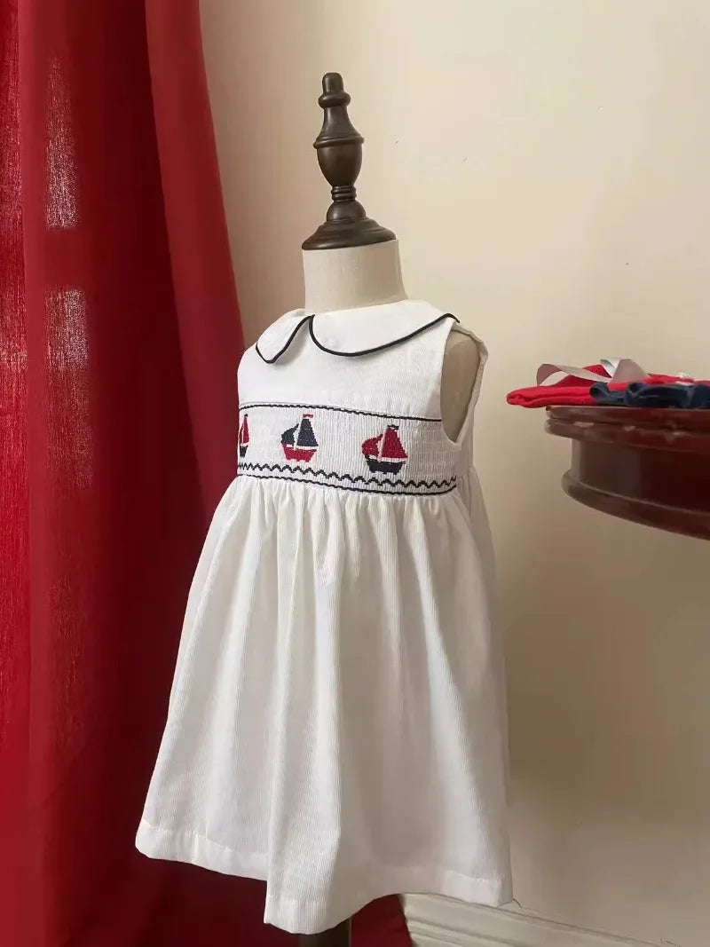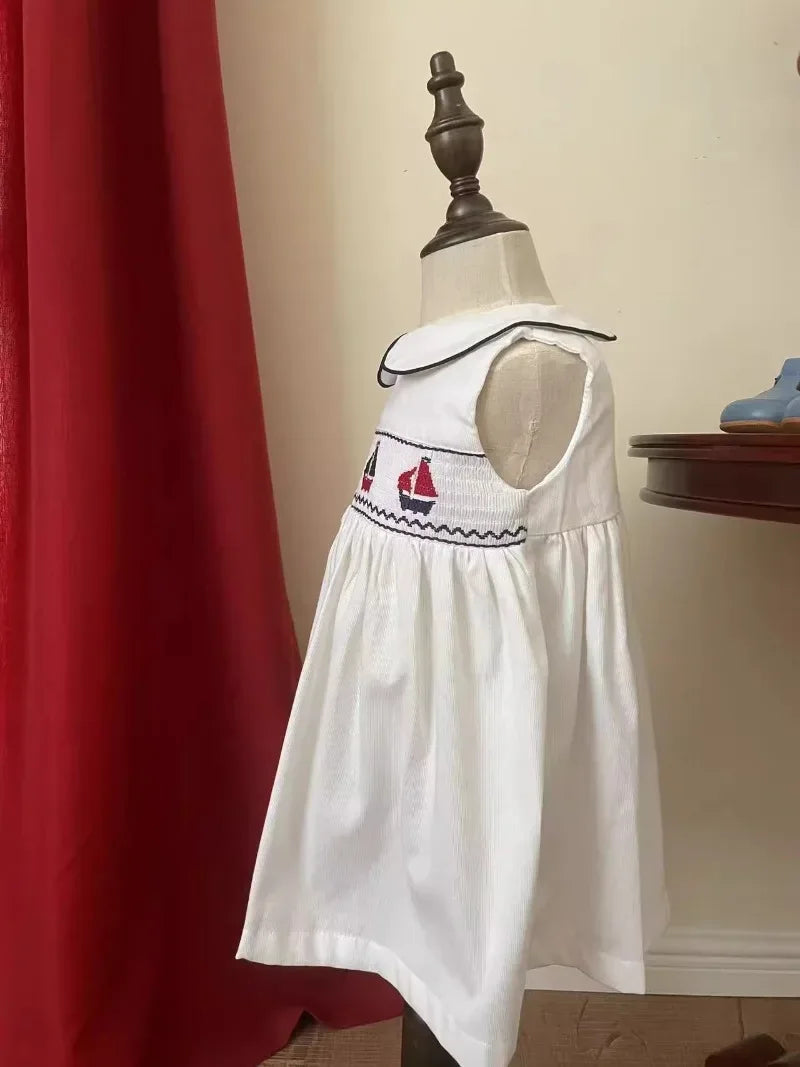 "Set Sail" Little Girl's Party Dress White & Colorful Embroidered Boats