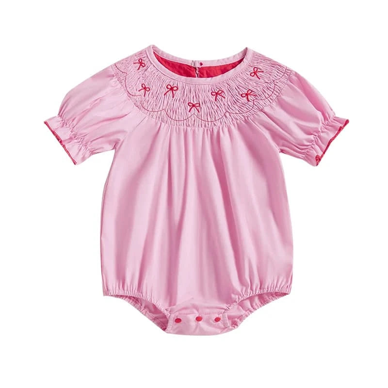 Dress your little one in charm with this Bow-Licious Smocked Bubble Romper with Puff Sleeves. This smocked baby bubble romper brings adorable style to any outing. The soft cotton fabric feels gentle on delicate skin and is perfect for year-round wear. The pretty smocked neckline features hand-stitched details and cute bow embroidery. Each romper is thoughtfully designed for comfort and movement. Your baby stays cool during playtime or cozy on special occasions.