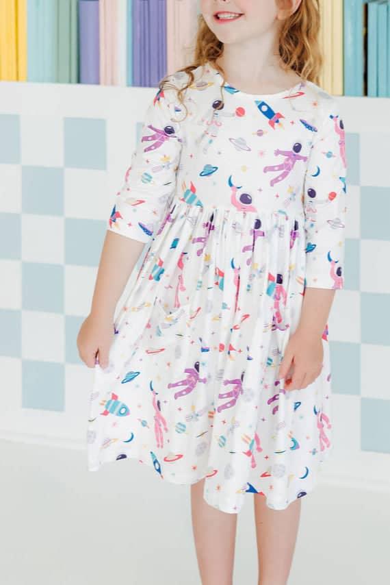 The space print twirl dress for girls has a classic twirl skirt and practical pockets. The fit is comfortable with a true-to-size design. The sleeves are 3/4 length. Choose the right size based on your child’s usual fit. If in between sizes, sizing up ensures extra growing room.