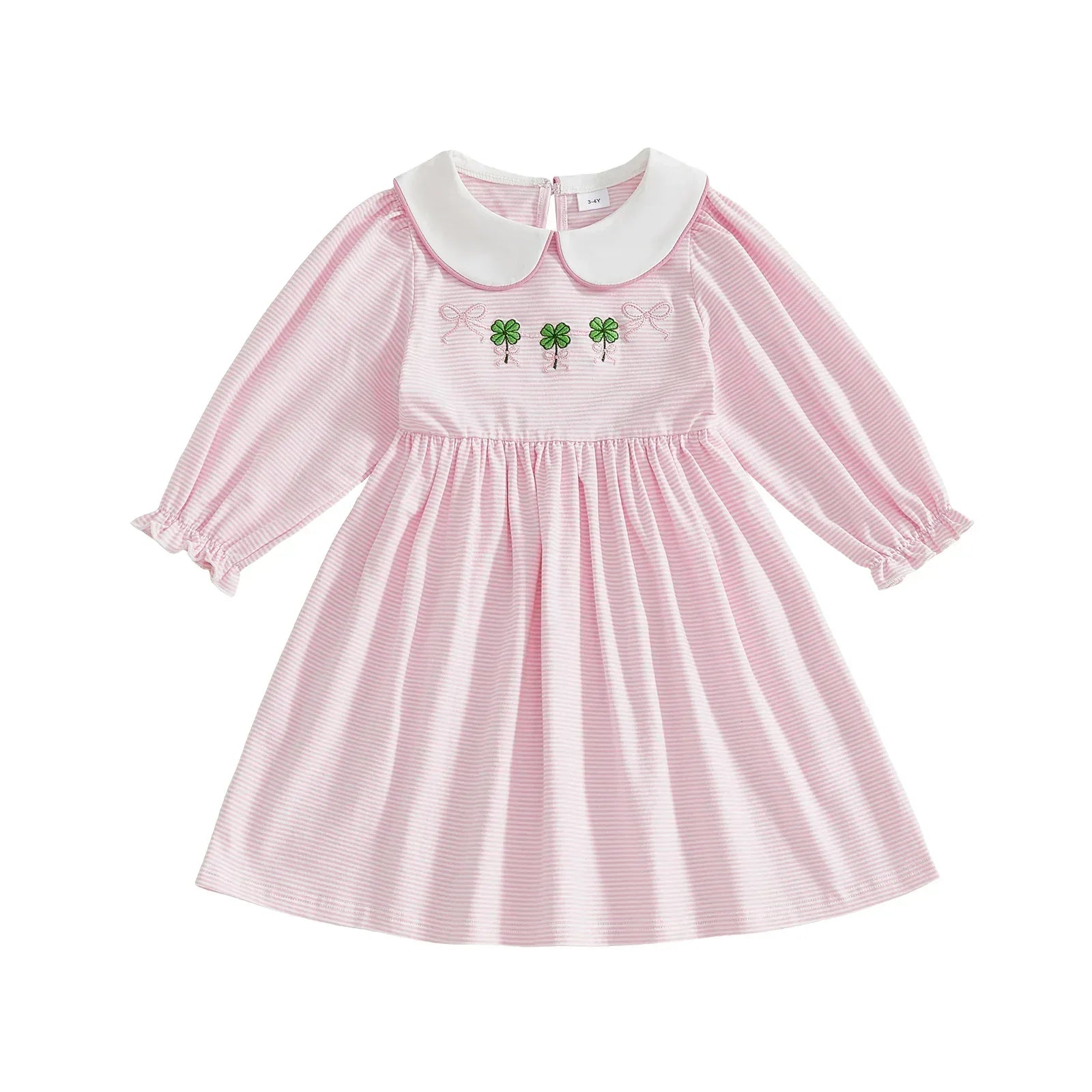 Green or blush colorway features cheerful shamrock embroidery near the collar. Subtle details make this St. Patrick's Day dress for little girls a festive choice for family photos, parties, or school events. Wash in cold water. Hang or lay flat to dry for best results. Fabric keeps shape and color after many washes.