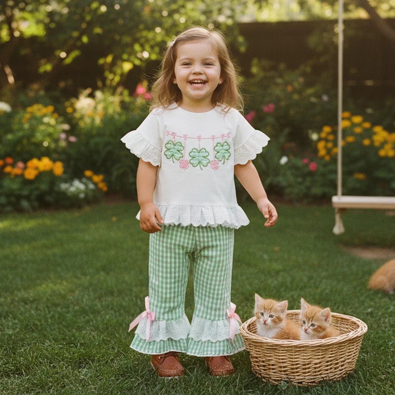 This St Patrick's Day outfit for girls stands out at school events, playdates, or family pictures. The bright colors look cheerful in any setting. The set stays in place during play and helps create happy memories. Pair it with a cute headband or favorite sneakers to complete her look. Add a jacket on cooler days—this set works in any weather.